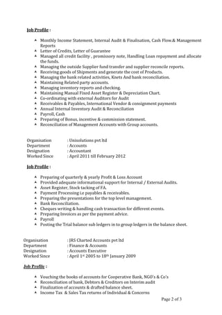 This document contains a resume for Johnson M.B. It summarizes his career objective, qualifications, skills, and work experience over 7+ years in finance and accounting roles. His experience includes preparing financial statements, managing accounts payable/receivable, payroll, inventory, and assisting with audits at several companies in Kuwait and India. He has an MBA and B.Com and is proficient in accounting software and Microsoft Office applications.