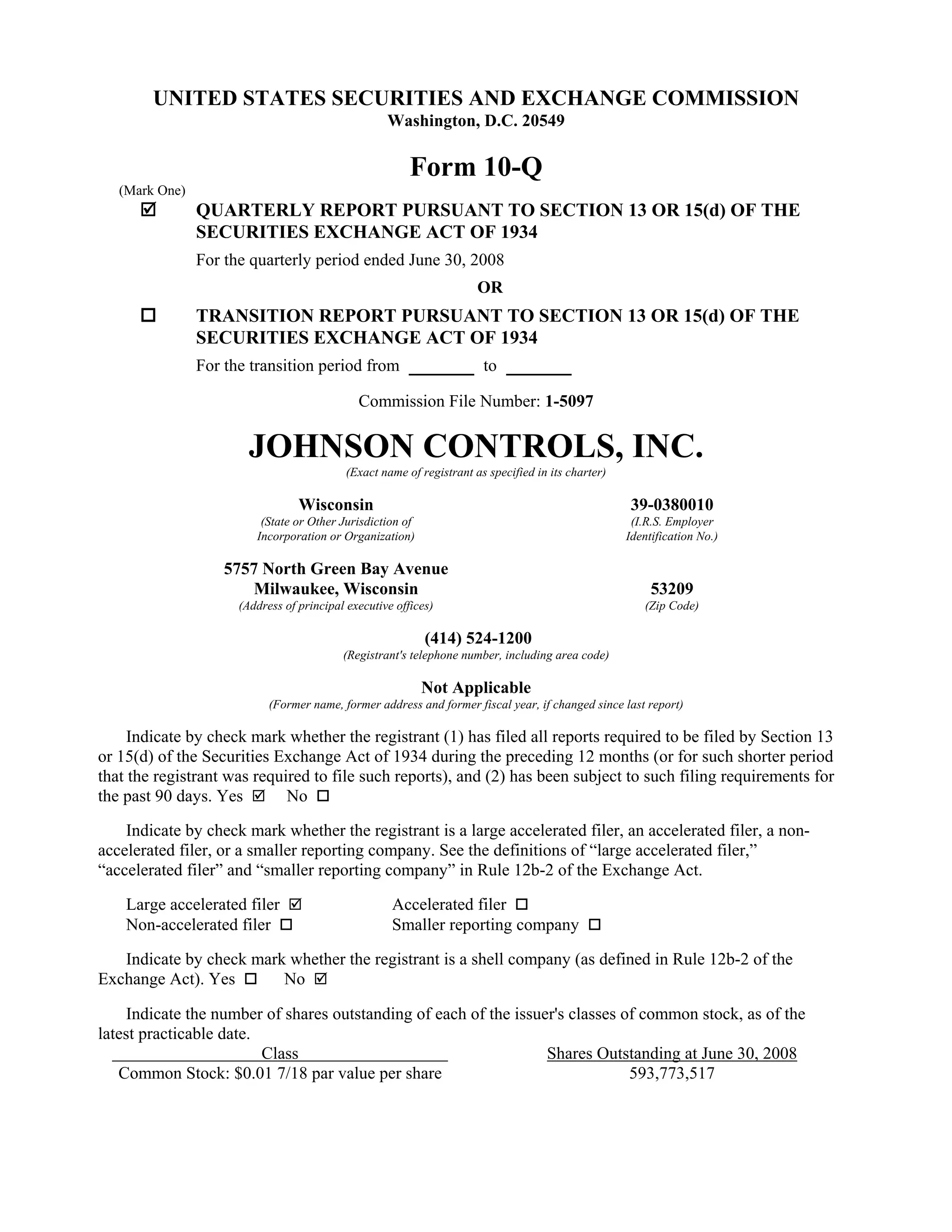 - The document is Johnson Controls' Form 10-Q quarterly report filed with the SEC for the quarter ended June 30, 2008. - It includes the company's condensed consolidated financial statements and notes for the quarter, including the balance sheet, income statement, and cash flow statement. - It provides key financial data such as net sales, costs, expenses, earnings, assets, liabilities, and cash flows for the quarter.