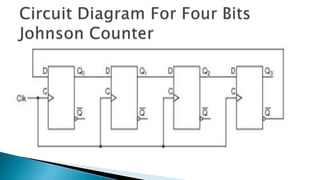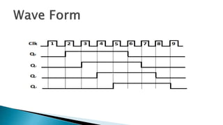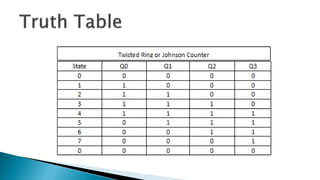 A binary counter uses multiple flip-flops depending on the number of bits required. There are two types of counters: synchronous uses a common clock for all flip-flops while asynchronous only clocks the first stage. A twisted ring or Johnson counter is similar to a ring counter but inverts the output of the last stage and feeds it back to the first stage input. This creates a pattern that is twice the length of the shift register and circulates indefinitely. Twisted ring counters are used in applications like walking LED displays and converting square waves to sine waves.