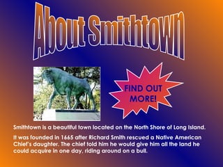 Smithtown is a town located on Long Island that was founded in 1665 after its namesake, Richard Smith, rescued a Native American chief's daughter. The town has a variety of restaurants, schools from elementary through high school, and shopping options including Smith Haven Mall, local boutiques, and chain stores. Smithtown offers different areas to live within the town like St. James or Lake Ronkonkoma, and is described as a beautiful small town location on Long Island.