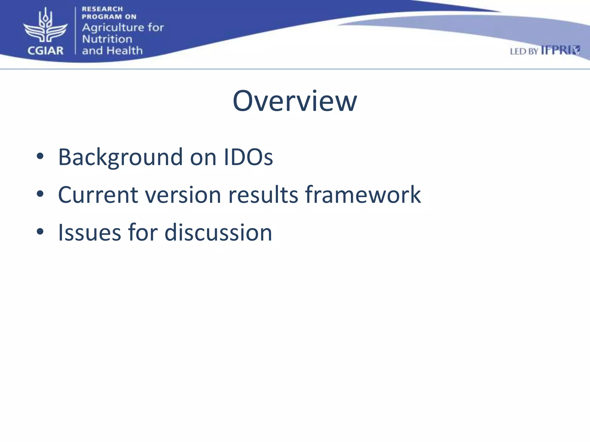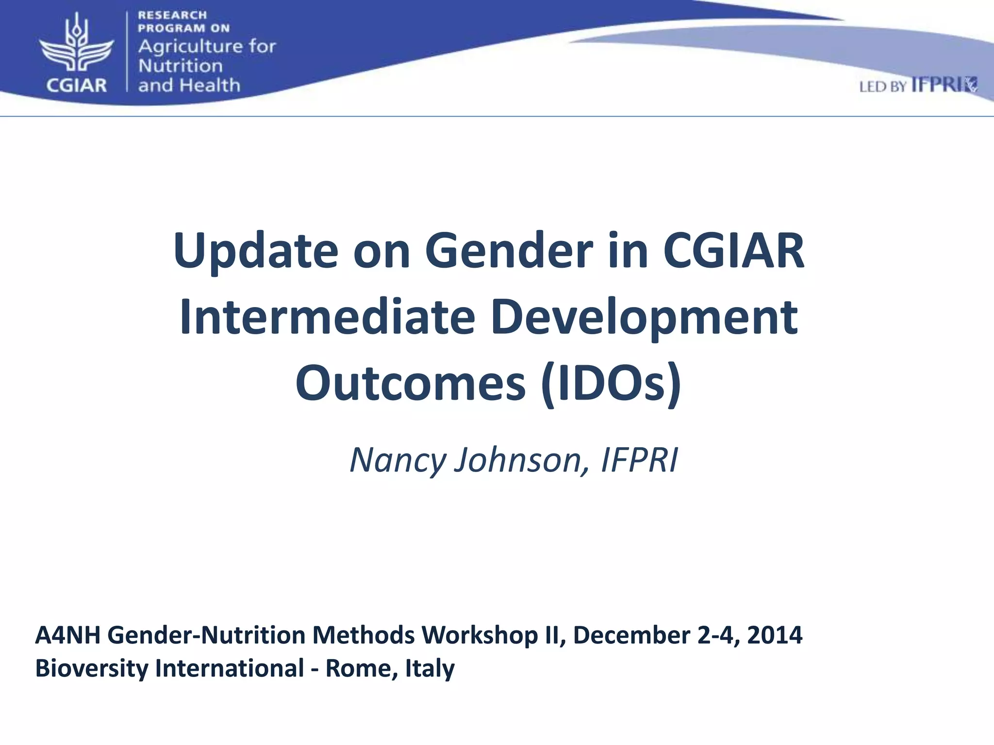 This document summarizes discussions around defining gender-related intermediate development outcomes (IDOs) for the CGIAR Strategy and Results Framework (SRF). It outlines the rationale and proposed indicators for a new gender IDO focusing on women's control over resources and participation in decision-making. Specifically, it discusses measuring women's participation in decisions around their own labor, income, and group organizations. The document also provides an update on integrating gender considerations more broadly throughout the SRF and calls for further input on priorities for international agricultural research.