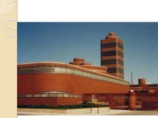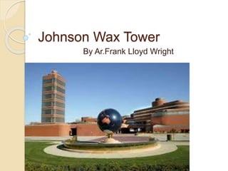 The document contains floor plans, cross sections, elevations, and views of the Johnson Wax Tower designed by Frank Lloyd Wright. The plans show the layout of the first, second, and third floors, while the cross section and elevations provide details of the building structure. Images also showcase Wright's unique lily pad columns and built-in furniture design.