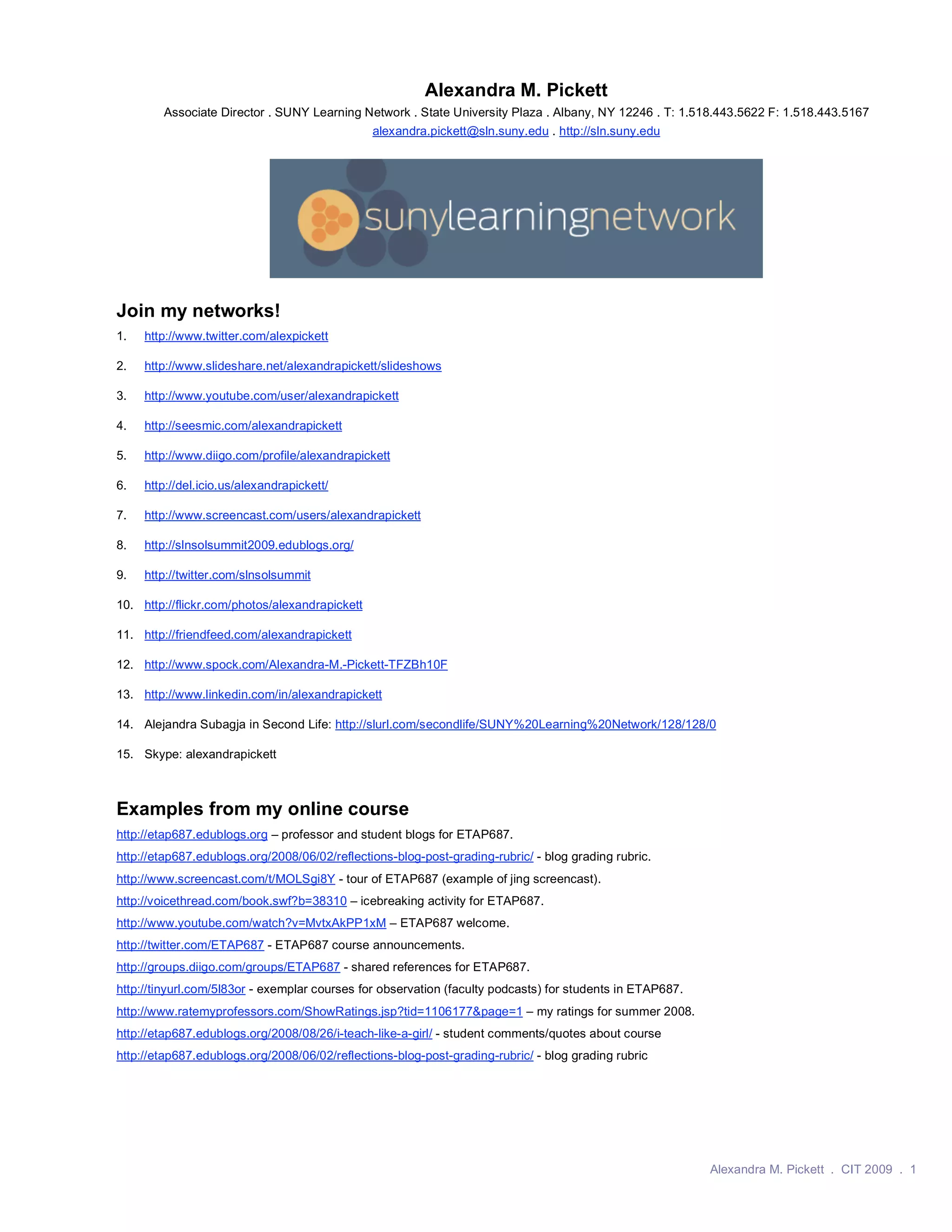The document contains contact information for Alexandra M. Pickett and lists 15 online networks she encourages people to join, including her profiles on Twitter, SlideShare, YouTube, Seesmic, Diigo and others. It then provides examples from her online course and lists various "cool tools" for online teaching and collaboration, such as Audacity, Skype, Jing, Animoto and Moodle. Videos are listed at the end that are relevant to online teaching.