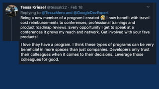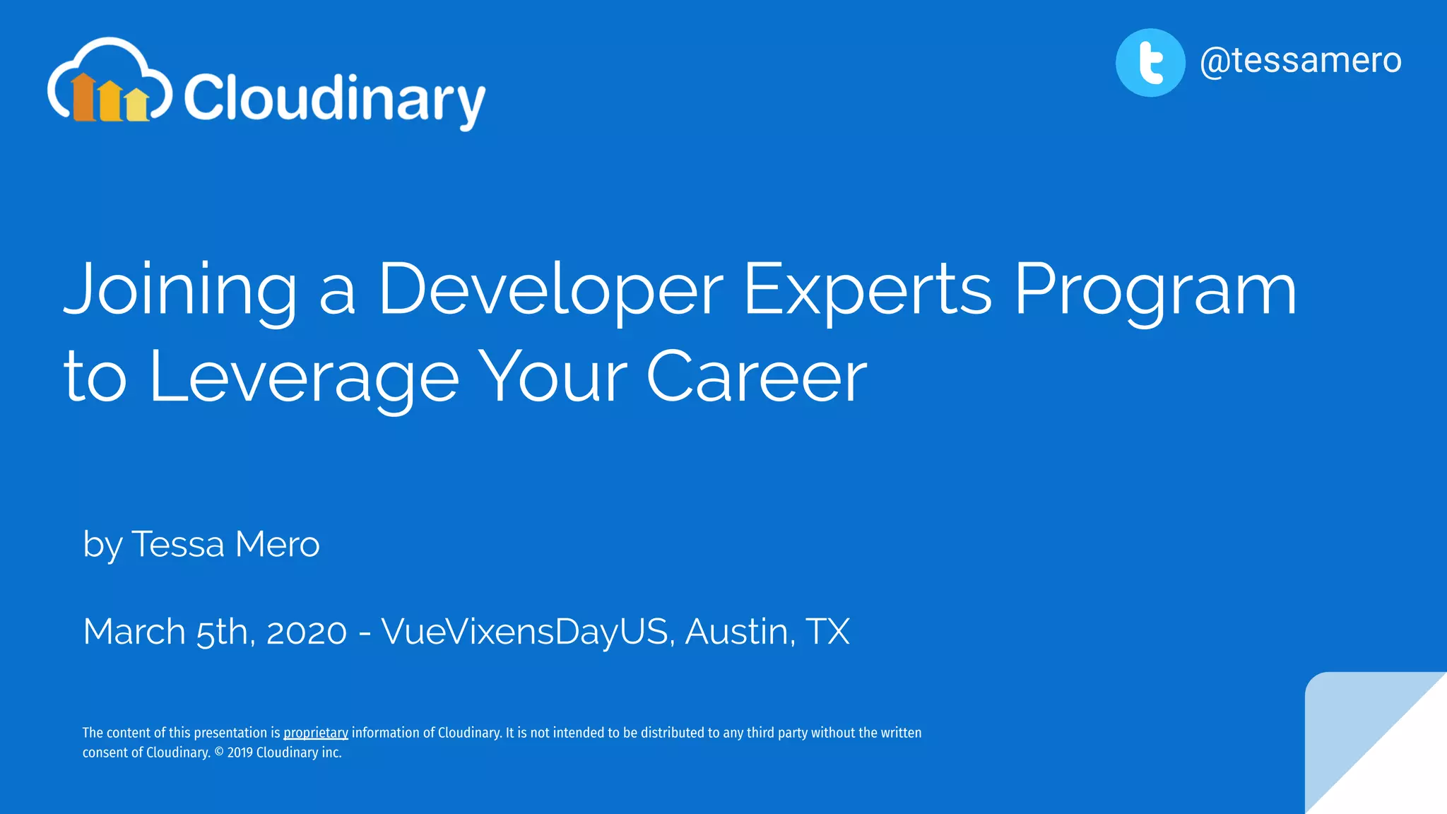This document discusses joining a developer experts program to advance one's career. It provides definitions of such programs, generally run by tech companies to promote their technologies. Requirements typically include being a technical expert and community leader, while benefits include recognition, access to early features, free accounts/training, and opportunities to attend events. The document advocates for joining the Cloudinary Media Developer Expert program specifically.