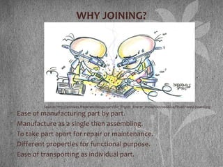 1. The document discusses various joining and fastening processes including welding, brazing, soldering, adhesive bonding, and mechanical fastening.