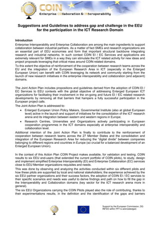 The document proposes a Joint Action Plan to address gaps and challenges for EEU organizations participating in ICT research. It analyzed six EEU pilot projects to identify barriers in enterprise interoperability and collaboration research. The Joint Action Plan aims to provide guidelines for EEU policymakers and researchers to better participate in European projects by removing barriers. It was developed through workshops involving EEU stakeholders to validate recommendations and examples of initiatives supporting ICT research in the EEU.