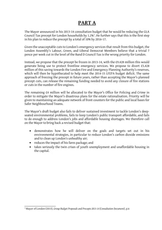 The report summarizes proposed amendments to London's Mayor's 2013-2014 consolidated budget from the London Assembly Labour, Green, and Liberal Democrat groups. They propose freezing the GLA Council Tax precept rather than accepting planned cuts, generating £9.428 million to protect emergency services from unacceptable cuts. £5.428 million would go to London Fire and Emergency Planning Authority reserves to avoid fire station closures or fewer fire engines. The remaining £4 million would go to the Mayor's Office for Policing and Crime to mitigate planned police station closures. They also call on the Mayor to invest more in environmental issues, affordable public transit and housing, and youth unemployment.
