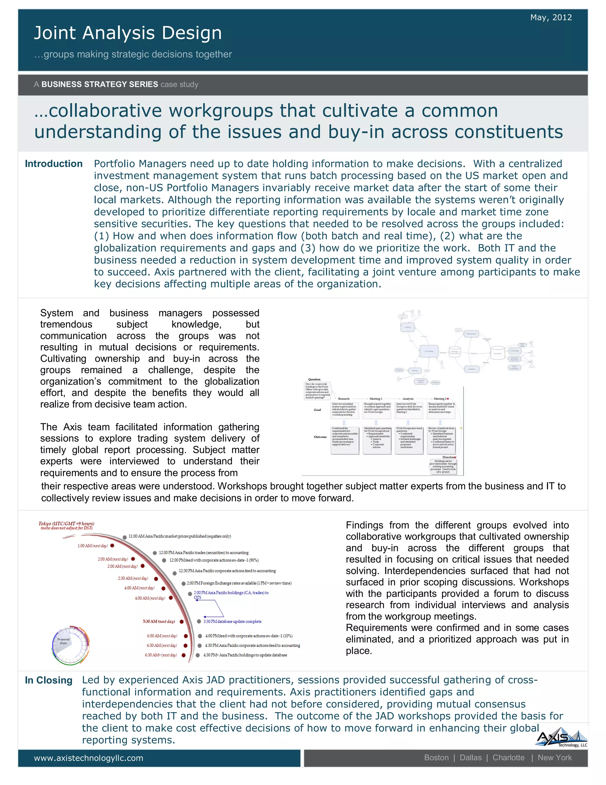 Axis facilitated joint analysis design (JAD) workshops between IT and business groups at a client organization to enhance their global reporting systems. Through interviews and collaborative workgroups, Axis helped surface gaps, interdependencies, and critical issues that had not previously been identified. This process cultivated mutual understanding and consensus across groups. The outcome of the JAD workshops provided an effective basis for the client to make cost-effective decisions on how to move their global reporting systems forward.