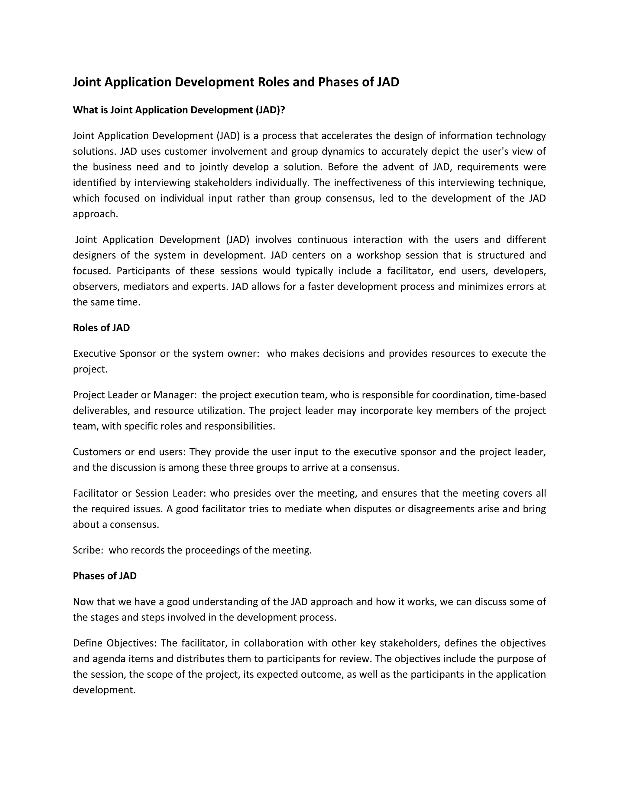 Joint Application Development (JAD) is a process that accelerates the design of IT solutions through customer involvement and group consensus building. It involves continuous interaction between users, developers, and other stakeholders through structured workshop sessions. Key roles in JAD include the executive sponsor, project manager, end users, facilitator, and scribe. The process consists of defining objectives, preparing for sessions, and holding sessions to jointly develop solutions. JAD allows for faster development with fewer errors through collaboration and consensus between stakeholders.