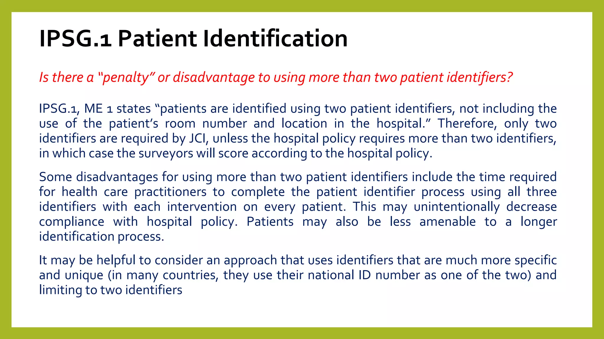 The document outlines various guidelines and standards related to patient identification, handover communication, medication management, surgical procedures, and safety protocols in hospitals. It emphasizes the necessity of using two patient identifiers for safety, the flexibility for hospitals to determine their processes, and the importance of documentation in patient care. Additional topics covered include fall risk screening, discharge instructions, informed consent processes, and the oversight of point-of-care testing.