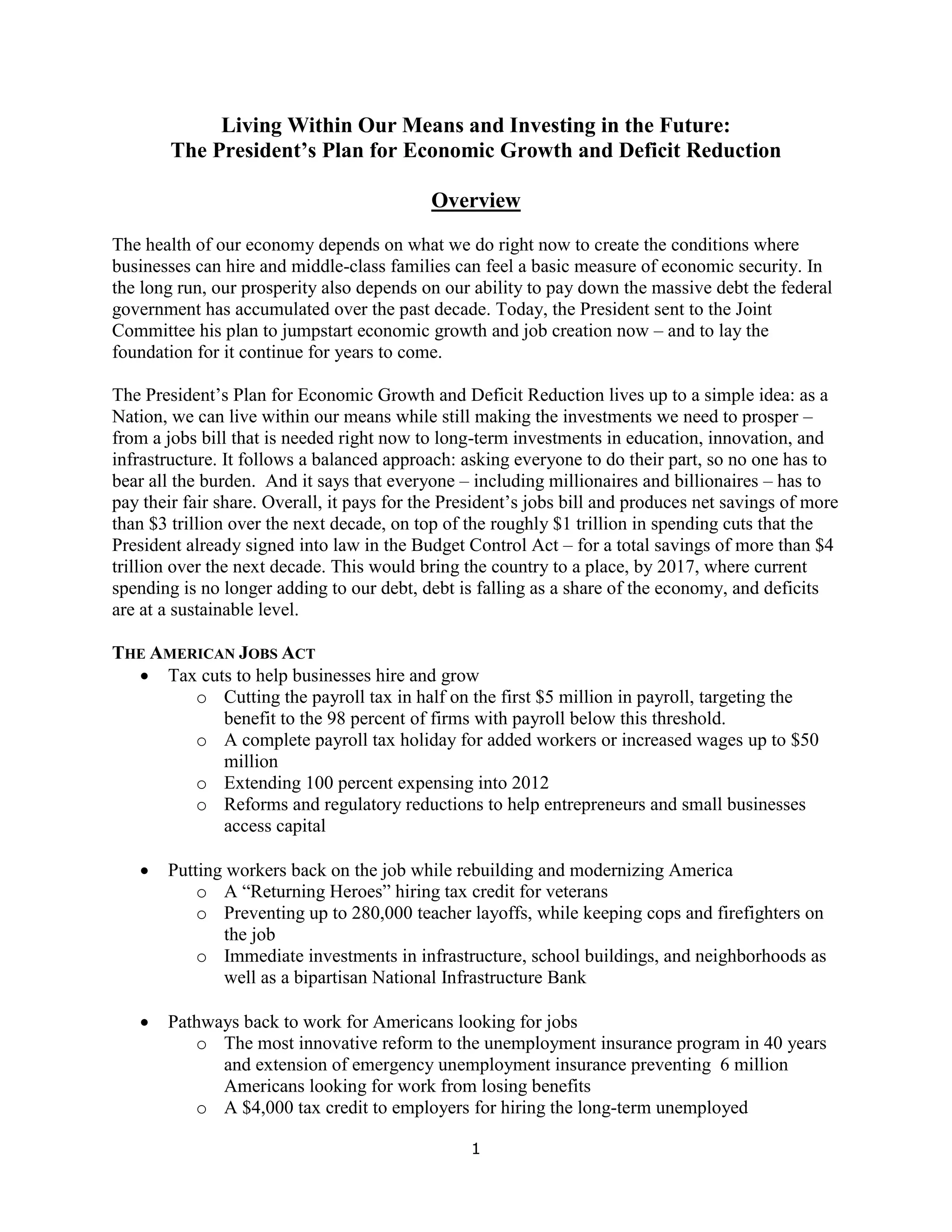 The President's plan aims to boost economic growth and job creation through short-term investments while reducing the deficit over 10 years. It includes $4.4 trillion in deficit reduction through spending cuts, health care savings, and tax reforms. The plan cuts the payroll tax for workers and businesses, extends unemployment benefits, and invests in infrastructure to create jobs now while reducing tax breaks for the wealthy to cut the long-term deficit. If enacted, the national debt would fall to 73% of GDP by 2021 compared to 90.7% if no action is taken.
