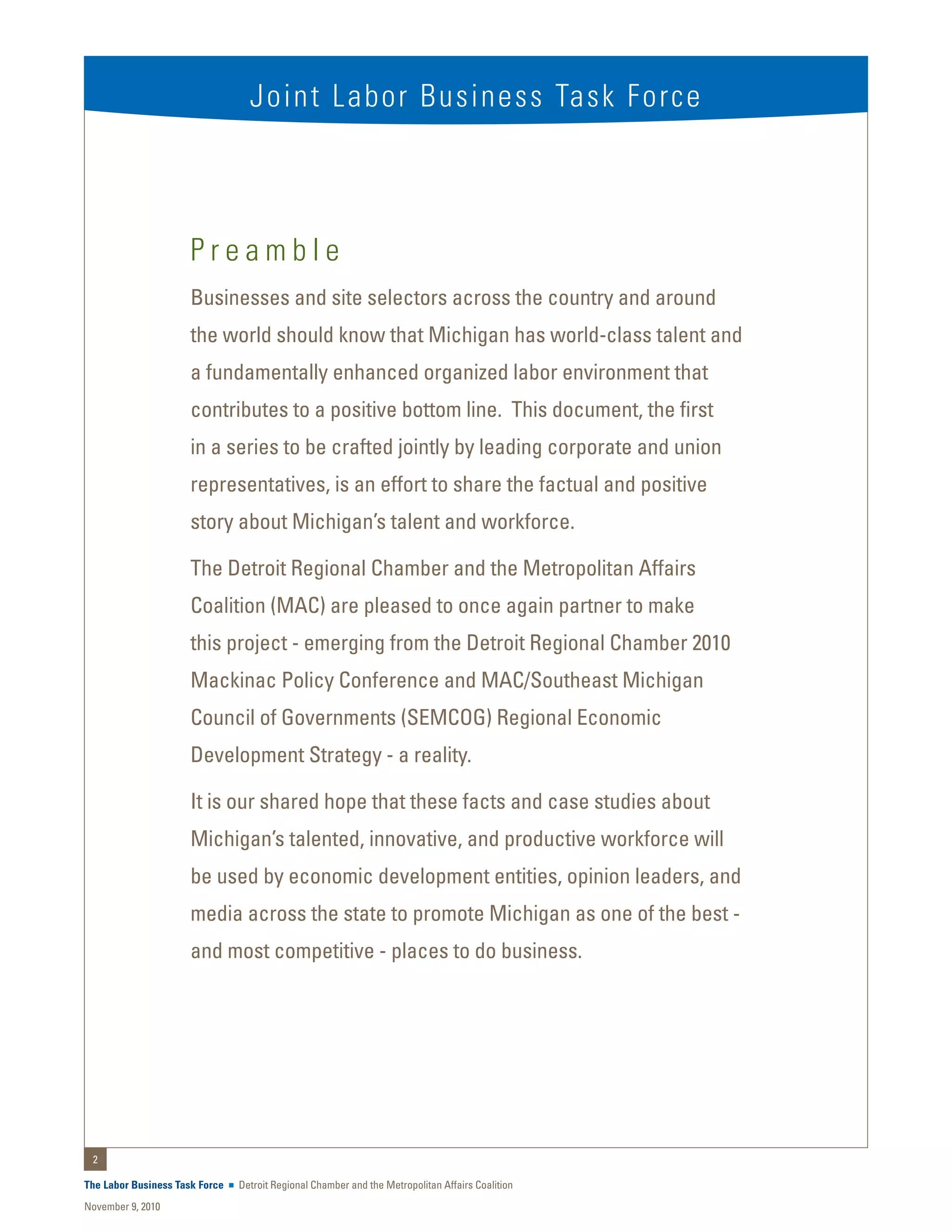 The document presents the positive narrative of Michigan's workforce, emphasizing its diverse and skilled talent pool, competitive wages, and innovative capabilities, particularly in sectors like advanced manufacturing and information technology. It highlights partnerships between labor and management in various industries to enhance productivity and address economic challenges, including testimonials from companies benefiting from Michigan's labor environment. The overall aim is to promote Michigan as an attractive place for businesses to thrive and invest.