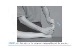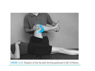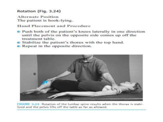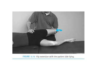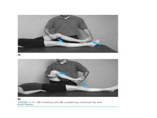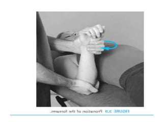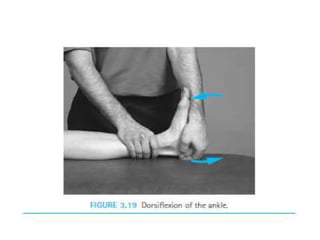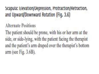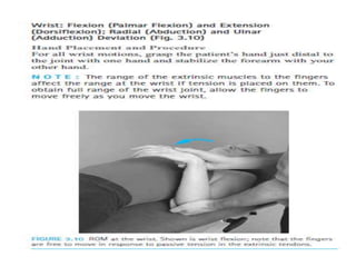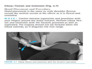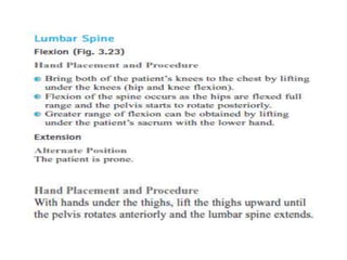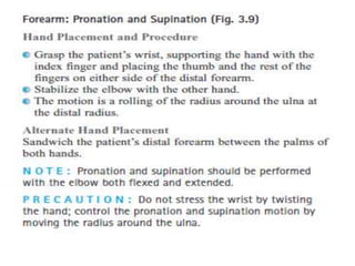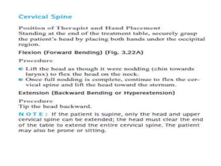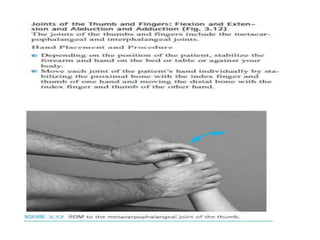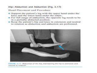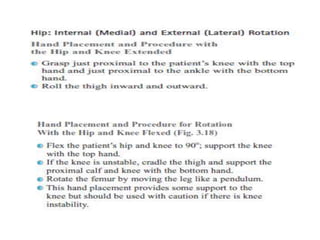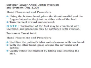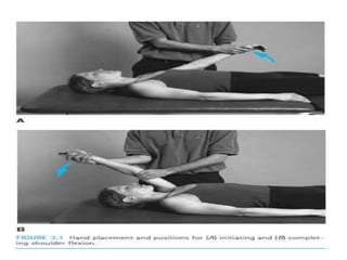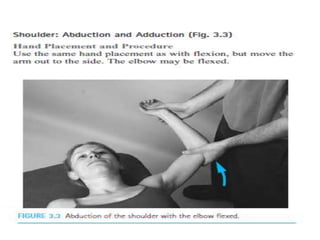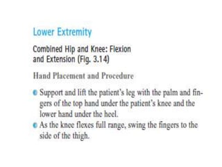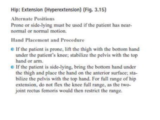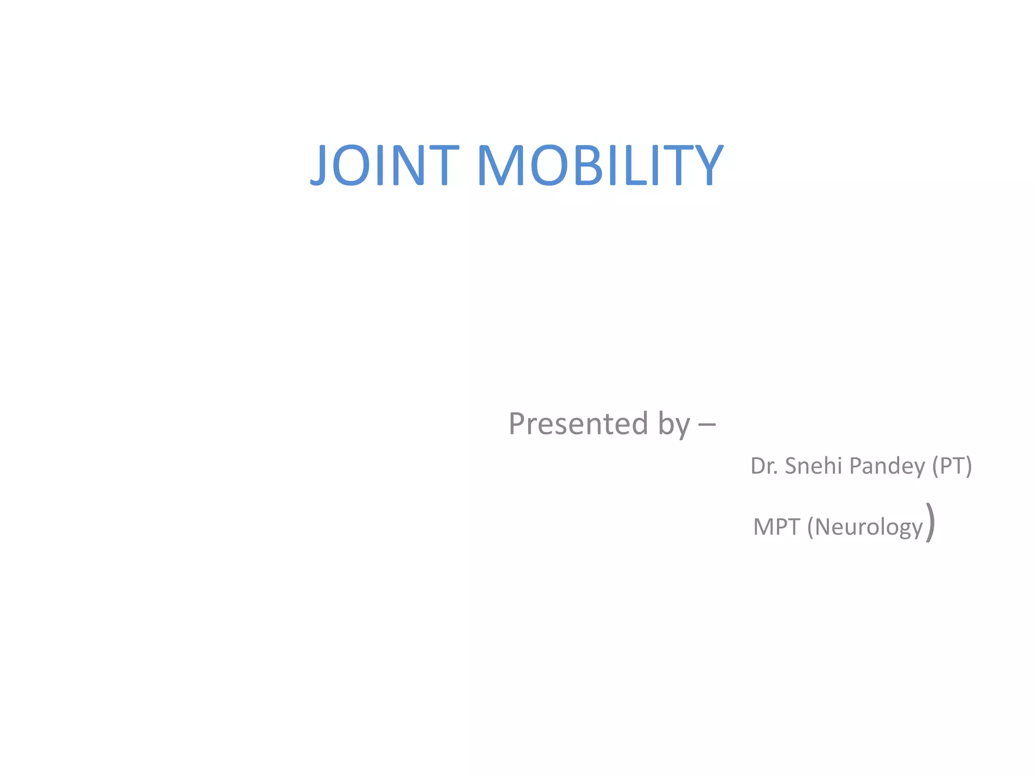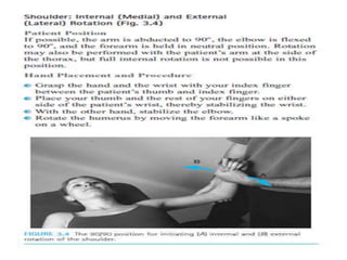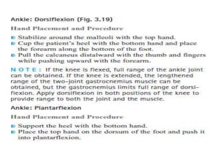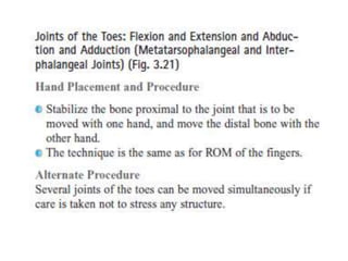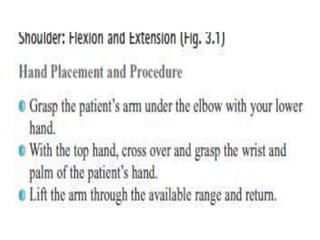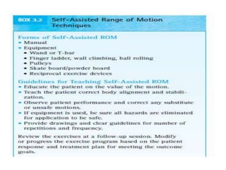 This document discusses joint mobility and range of motion exercises. It defines types of range of motion including active, passive, and active-assisted. It describes causes of limited mobility like injury, immobilization, or lifestyle. The principles, preparation, and techniques for range of motion exercises are outlined, including positioning, monitoring the patient's response, and moving joints smoothly through their pain-free range. Guidelines are provided for applying range of motion exercises to individual joints. The goals are to maintain joint mobility and function while avoiding further injury.