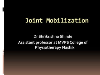 The document outlines joint mobilization techniques as presented by Dr. Shrikrishna Shinde, emphasizing the distinction between mobilization and manipulation, alongside the fundamental concepts of joint motion and arthrokinematics. It details various joint movements, including rolling, sliding, and spinning, and includes information about Maitland joint mobilization grading scale to manage pain and improve joint mobility. Additionally, the document covers the application and techniques of joint mobilization, along with patient positioning, treatment forces, and the importance of evaluating patient responses.