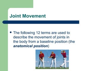 The document defines 12 terms used to describe joint movement from a baseline position: flexion and extension refer to decreasing and increasing the angle at a joint; abduction and adduction refer to movement away from and toward the body's midline; rotation and circumduction refer to movement around an axis and a combination of flexion, extension, abduction and adduction; plantar flexion and dorsiflexion refer to pointing the toes down and pulling the foot back; pronation and supination refer to rotating the forearm to turn the palm over and back; inversion and eversion refer to medial and lateral rotation of the foot.