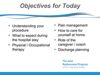 The document provides information about total joint replacement surgery and recovery. It discusses the procedures for total knee, total hip, and unicompartmental knee replacement surgeries. It outlines the pre-operative education process, what to expect during hospitalization including physical and occupational therapy, pain management, and discharge planning. The roles of nursing, physical therapy, social work, and caregivers in the recovery process are also summarized.