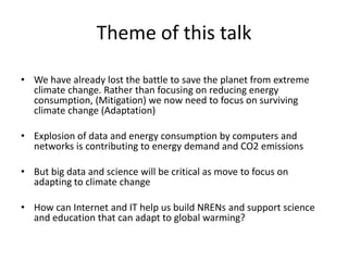 This document discusses strategies for data-intensive science in a carbon constrained world due to climate change. It argues that while efforts to reduce emissions are no longer sufficient, data and computing will be critical to adapt to climate impacts. However, the growth of data and computing also contributes to emissions. The document examines how climate change will impact weather patterns, droughts, and energy systems. It also looks at how internet and research networks can help support science and education for adaptation, such as through brokered green clouds, software-defined networks, wireless networks, dynamic optical networks, and eScience platforms. The goal is to address data and collaboration needs while reducing emissions and adapting to climate disruptions.