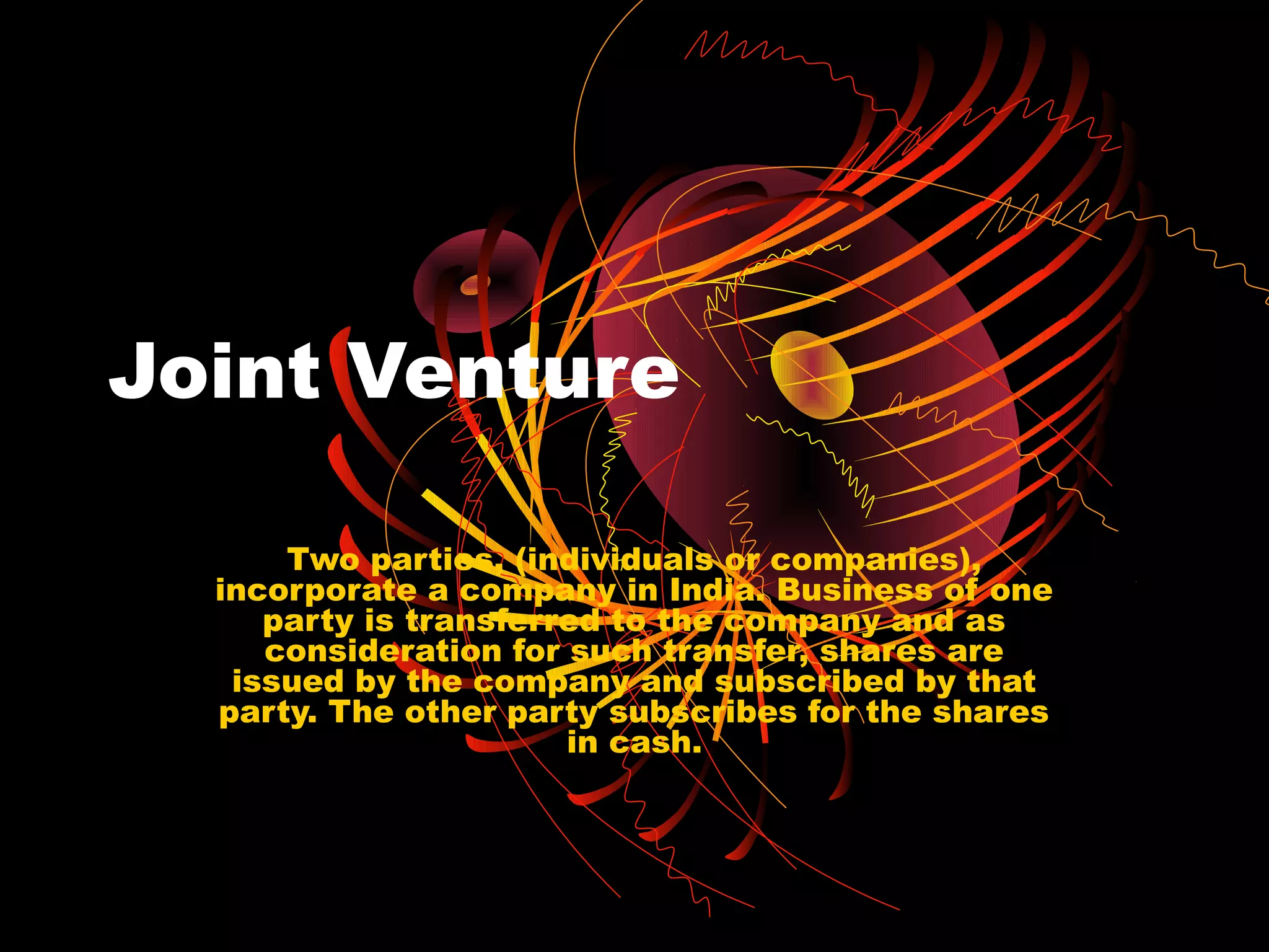 Two parties form a joint venture company in India. One party transfers its business to the company and receives shares in return. The other party subscribes to shares in the company by paying cash. A joint venture can be domestic, between partners of the same nationality, or international, between partners of different nationalities. Key clauses in a joint venture agreement address shareholding proportions, board composition, decision making, funding, confidentiality, dispute resolution, and termination.