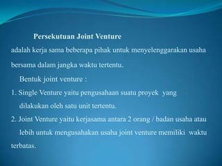 Dokumen tersebut membahas tentang persekutuan joint venture, yang merupakan kerja sama beberapa pihak untuk menjalankan usaha bersama dalam jangka waktu tertentu. Ada dua bentuk joint venture, yaitu single venture untuk satu proyek dan joint venture antar dua atau lebih badan usaha. Akuntansi joint venture dapat diselenggarakan terpisah dari anggotanya atau tidak.