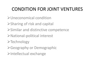 A joint venture is a business agreement where two or more parties pool their resources for a specific project or business activity for a finite period of time. They share control over the new entity, contributing equity and sharing revenues, expenses, and assets. Joint ventures allow parties to minimize risk, reduce individual investment needs, and gain access to new technologies, markets, and expertise. However, challenges can arise from differences in cultures, management styles, levels of investment, and potential conflicts between partners.