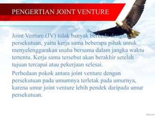 Dokumen tersebut membahas tentang pengertian dan akuntansi joint venture. Joint venture adalah kerja sama beberapa pihak untuk menjalankan usaha bersama dalam jangka waktu tertentu. Ada dua metode akuntansi joint venture, yaitu metode akuntansi terpisah dimana setiap sekutu mencatat investasinya sendiri, dan metode akuntansi tidak terpisah dimana managing partner mencatat seluruh transaksi joint venture.