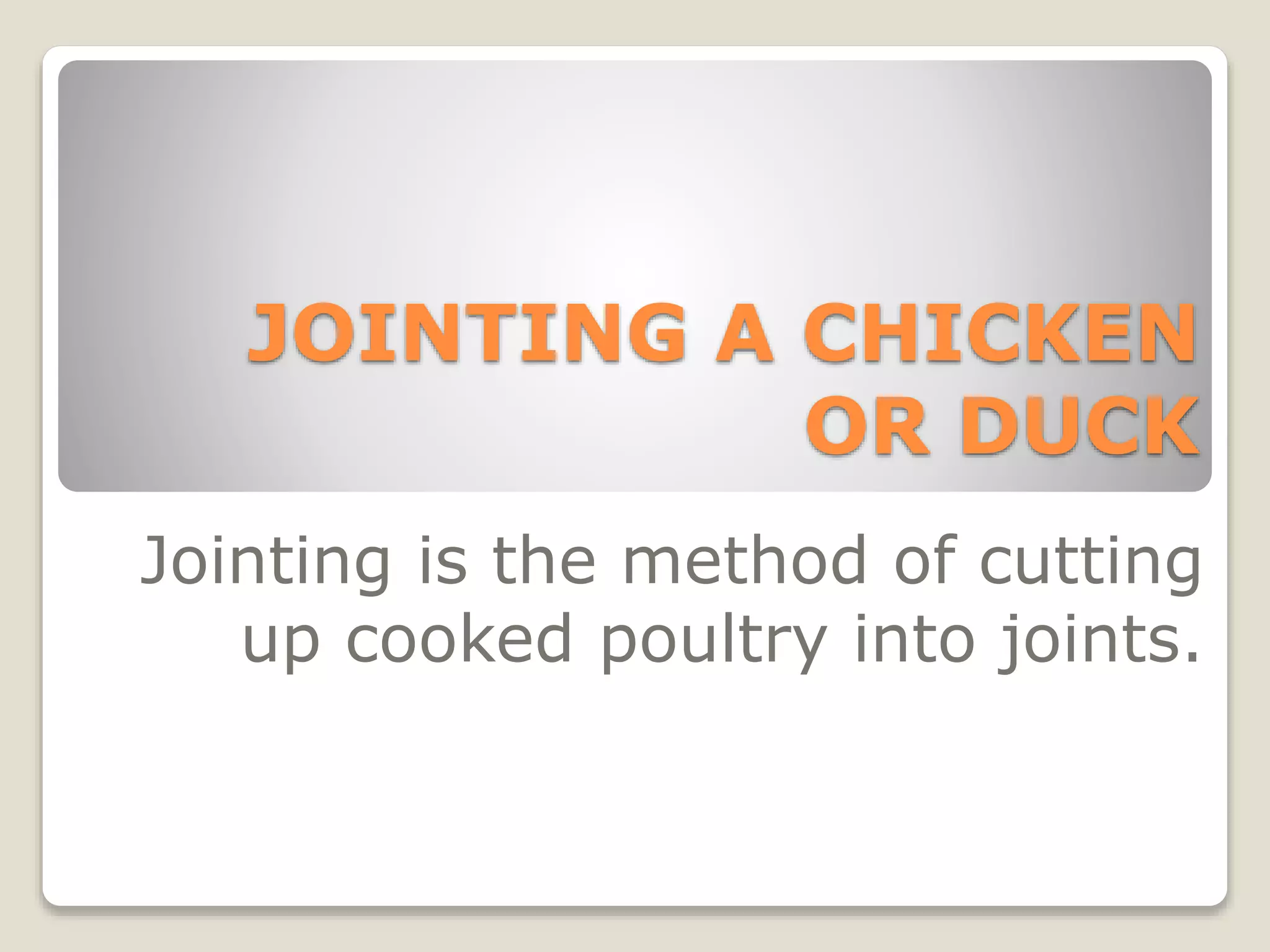 The document provides instructions for jointing cooked chicken or duck by cutting the skin between the legs and body, removing the legs and wings, and cutting the breast in half. It also describes how to draw raw poultry by removing the head, neck, entrails, and giblets. Proper dressing, jointing, and drawing of poultry is important for consumers to prepare meat safely for cooking and eating.