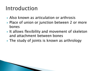 This document discusses the classification and structure of joints in the human body. It describes three types of joints: fibrous joints, cartilaginous joints, and synovial joints. Synovial joints are the most common and include ball-and-socket joints, hinge joints, pivot joints, gliding joints, condyloid joints, and saddle joints. These joints are characterized by an articular capsule containing synovial fluid that lubricates and nourishes the joint structures to allow movement.