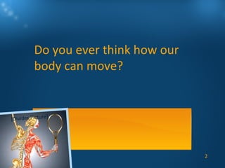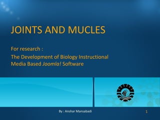 This document discusses joints and muscles in the human body. It describes the main types of joints, including ball-and-socket, hinge, and synovial joints, and their roles in enabling different movements. It also outlines the three main types of muscles: skeletal, smooth, and cardiac muscles, and their distinguishing characteristics such as whether they are voluntary or involuntary. Skeletal muscles are attached to bones and controlled voluntarily, while smooth and cardiac muscles function involuntarily within internal organs and the heart.