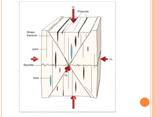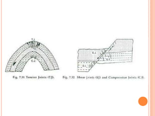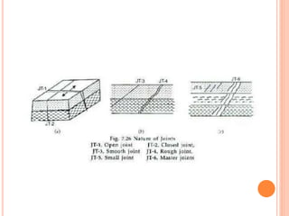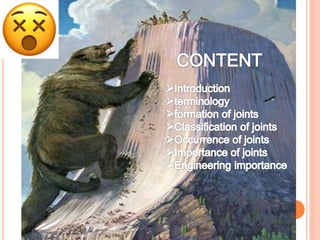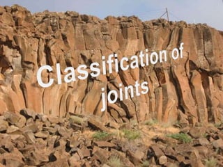 Joints are cracks or fractures in rocks that divide the rock mass into blocks. They form due to tensile and compressive stresses from processes like cooling/crystallization of igneous rocks, erosion, seismic activity, and tectonic plate movement. Joints can be systematic or non-systematic, and are classified by their orientation, geometry, and origin. Joints are important both geologically and economically, as they influence groundwater flow, quarrying, tunnel construction, and more.