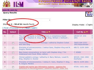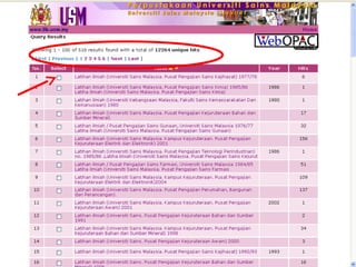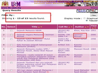 Dokumen ini menjelaskan tentang fungsi dan penggunaan perpustakaan, termasuk cara mencari bahan melalui katalog dalam talian (OPAC) dan informasi tentang layanan yang tersedia. Pengguna dapat melakukan pencarian berdasarkan judul, penulis, atau subjek, serta melakukan peminjaman dan pemesanan buku secara dalam talian. Terdapat juga panduan mengenai lokasi buku di rak dan cara menghubungi staf perpustakaan untuk bantuan.