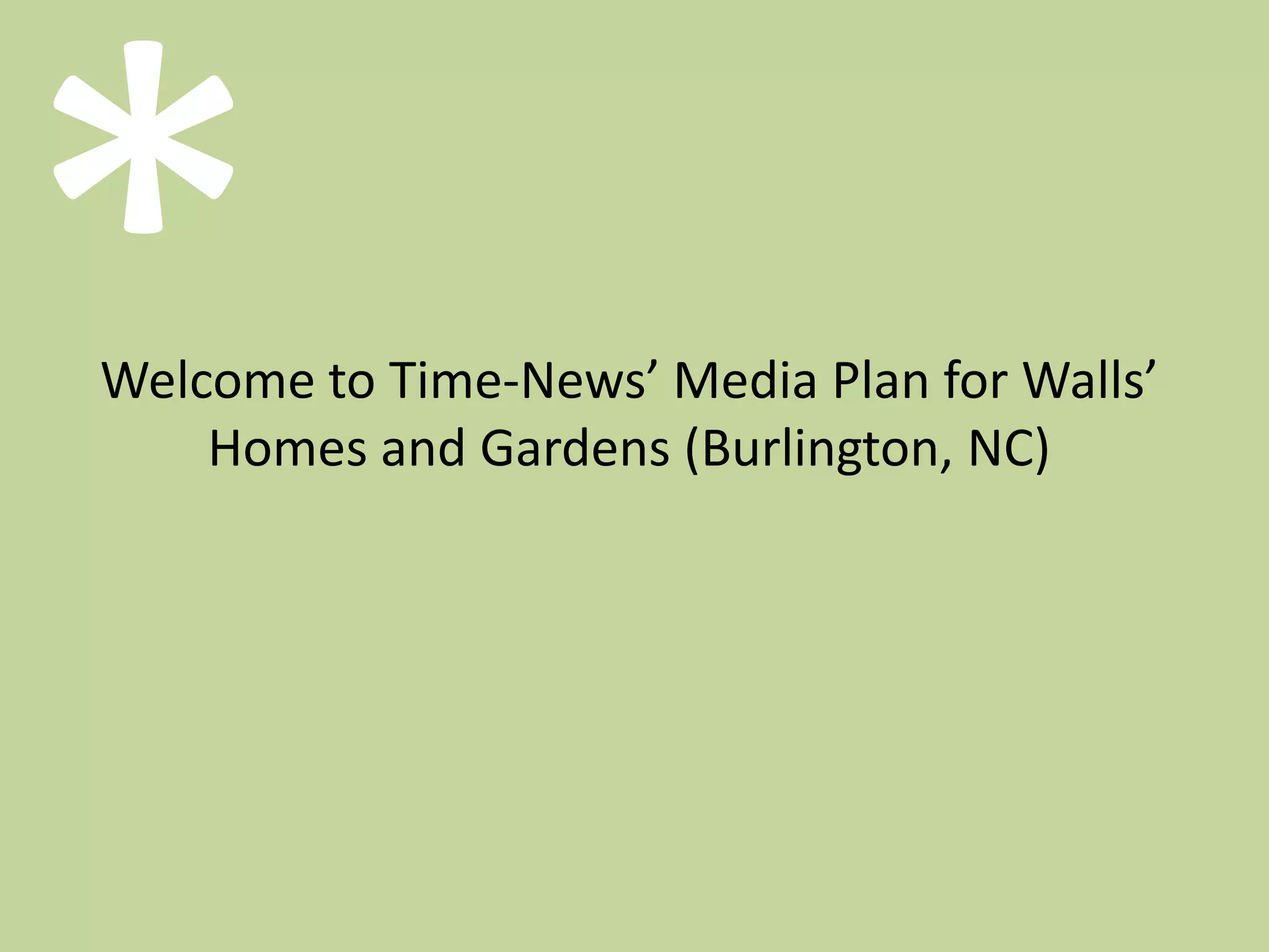 The document outlines a media plan for Walls' Homes and Gardens to advertise in the Times-News newspaper. It recommends running ads 3 times a week to target homeowners and focus on specific seasons to promote building materials, garden supplies, and home furnishings. The proposed annual ad budget is $61,875 to run over 4,000 inches of ads in the daily and Sunday papers. The plan aims to increase revenues for Walls' Homes and Gardens by getting their name out through the trusted newspaper source and targeted promotions.