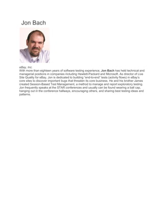 Jon Bach, with over eighteen years of software testing experience, discusses the evolution of testing from 1994 to 2014, emphasizing the shift towards automation and the challenges faced in a DevOps environment. He shares insights on the nature of testing as a discovery process and presents practical solutions for improving testing practices. The presentation also highlights the importance of adapting to changing contexts and the need for creativity and innovation in testing.