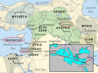 Jonah was called by God to prophesy against Nineveh but disobeyed and boarded a ship to Tarshish. A storm arose and Jonah was thrown into the sea, being swallowed by a large fish. After repenting inside the fish, Jonah was vomited onto dry land and went to Nineveh, prophesying its destruction. The Ninevites repented, sparing the city. Later, Jonah grew angry that Nineveh was spared and God sought to teach him about divine mercy through a plant and worm. The book highlights God's forgiveness and compassion.