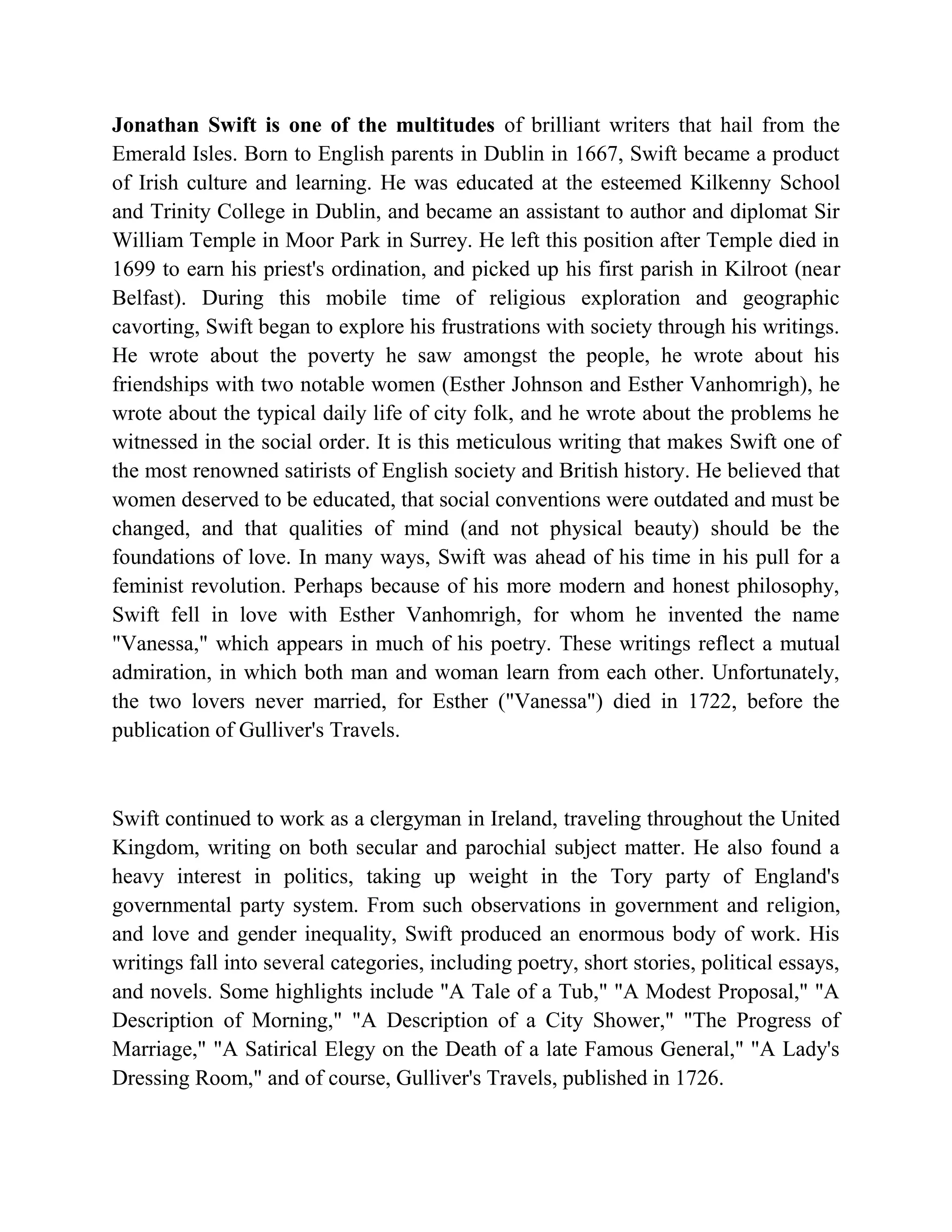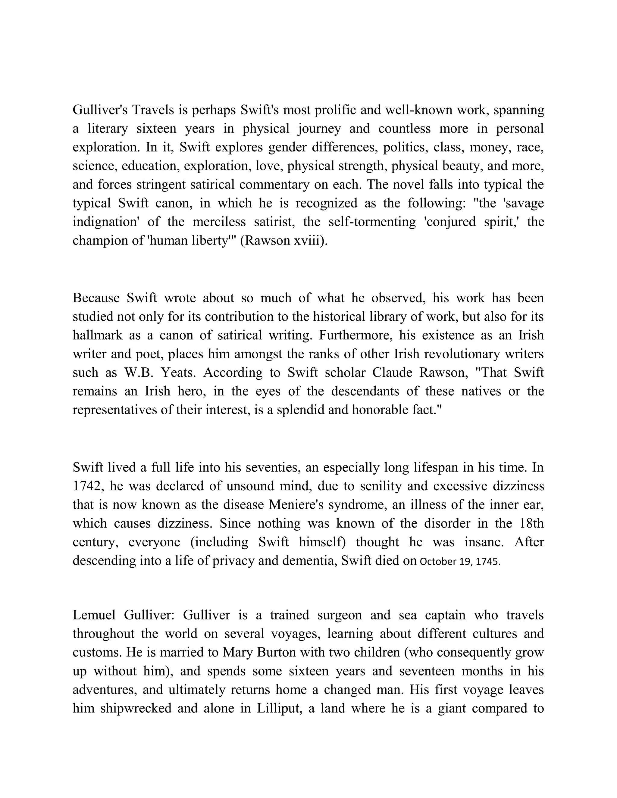 Jonathan Swift is one of Ireland's most renowned satirists. Born in Dublin in 1667, he was educated at Kilkenny School and Trinity College before becoming an assistant to Sir William Temple. During this time, he began writing about the social issues he witnessed. His most famous work, Gulliver's Travels, was published in 1726 and uses satire to critique politics, society, and human nature by chronicling the voyages of Lemuel Gulliver. Gulliver encounters tiny Lilliputians, giant Brobdingnags, and rational horses as a way to comment on European civilization. Swift's work made him one of England's most prominent social commentators.