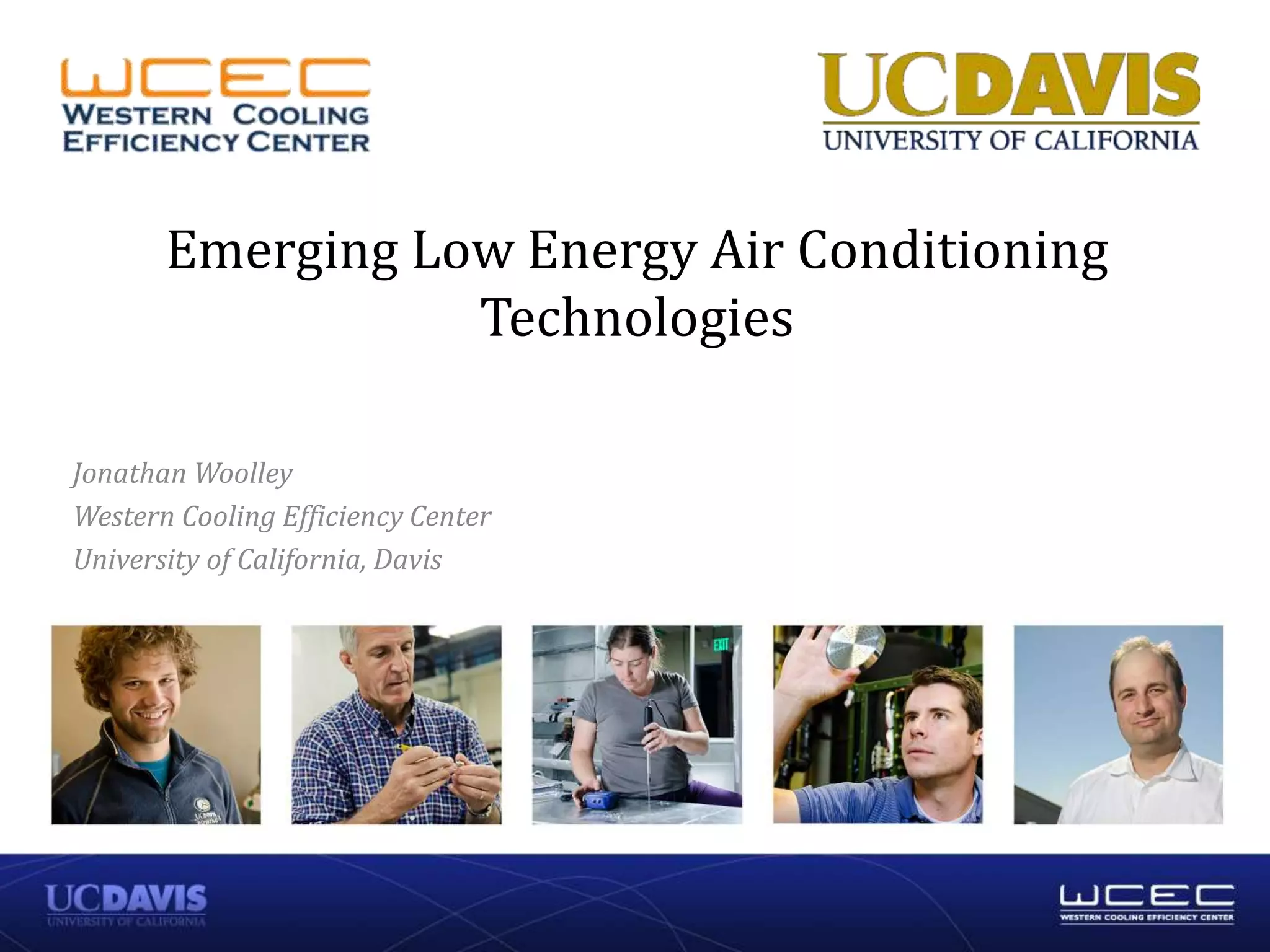 1. The document discusses emerging low energy air conditioning technologies being researched at the Western Cooling Efficiency Center.