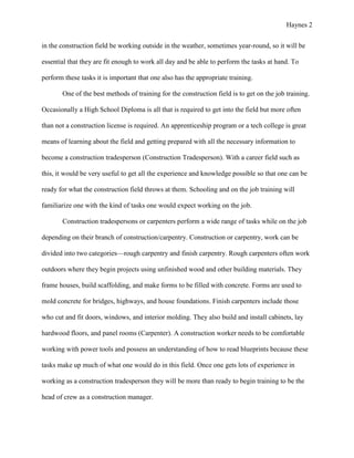 The document discusses the career of a construction contractor. It describes the typical career path, starting as a construction tradesperson to gain experience before obtaining additional training or education to become a construction manager or contractor. It outlines the key responsibilities of a contractor, which include supervising construction projects, managing budgets and schedules, and ensuring work meets regulations. Contractors can earn between $50,000 to $150,000 annually depending on their experience and project size. The employment outlook for contractors is excellent as infrastructure and housing demand is expected to increase the need for construction workers in coming years.