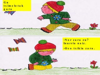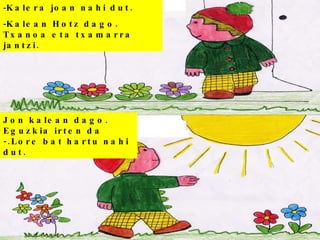 Kalera joan nahidut. Kalean Hotz dago. Txanoa eta txamarra jantzi. Jon kalean dago. Eguzkia irten da -.Lore bat hartu nahi dut. - 2.