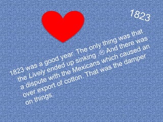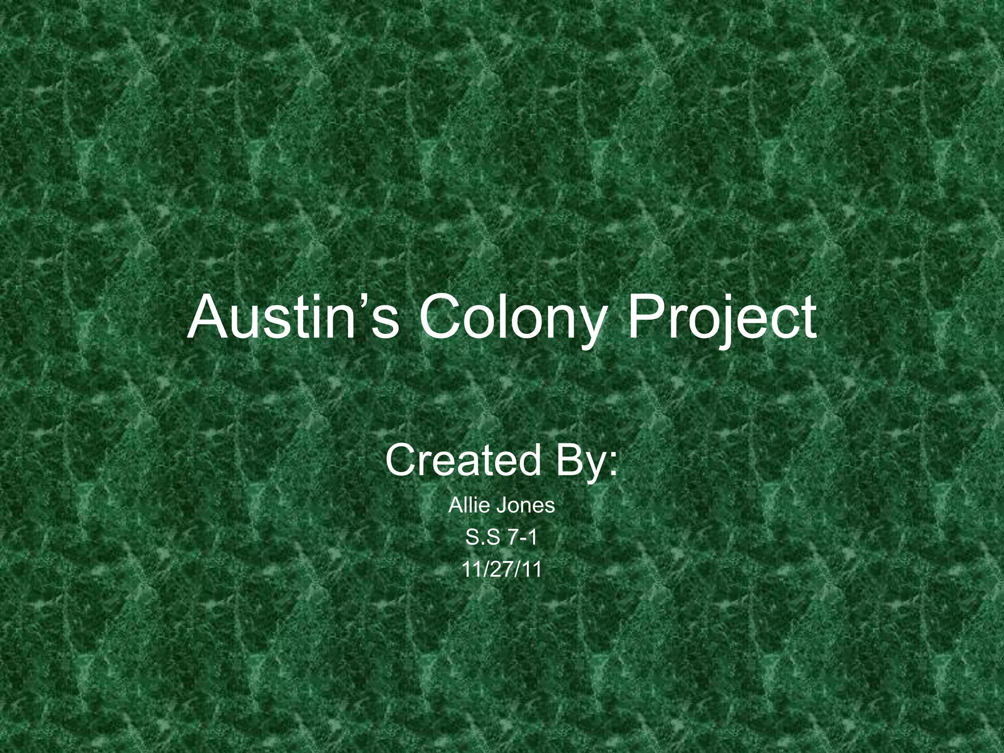 This document appears to be a student project about Austin's Colony. It contains 8 photographs with captions describing different aspects of life in the colony, including a family's first home, their buggy, the husband working at a lumber mill, their land and cattle, a mild winter by a creek, an Indian attack on the village, cotton plants ready for harvest, and an overall picture of the colony. The photographs provide a visual representation of what life was like for settlers in Austin's Colony.