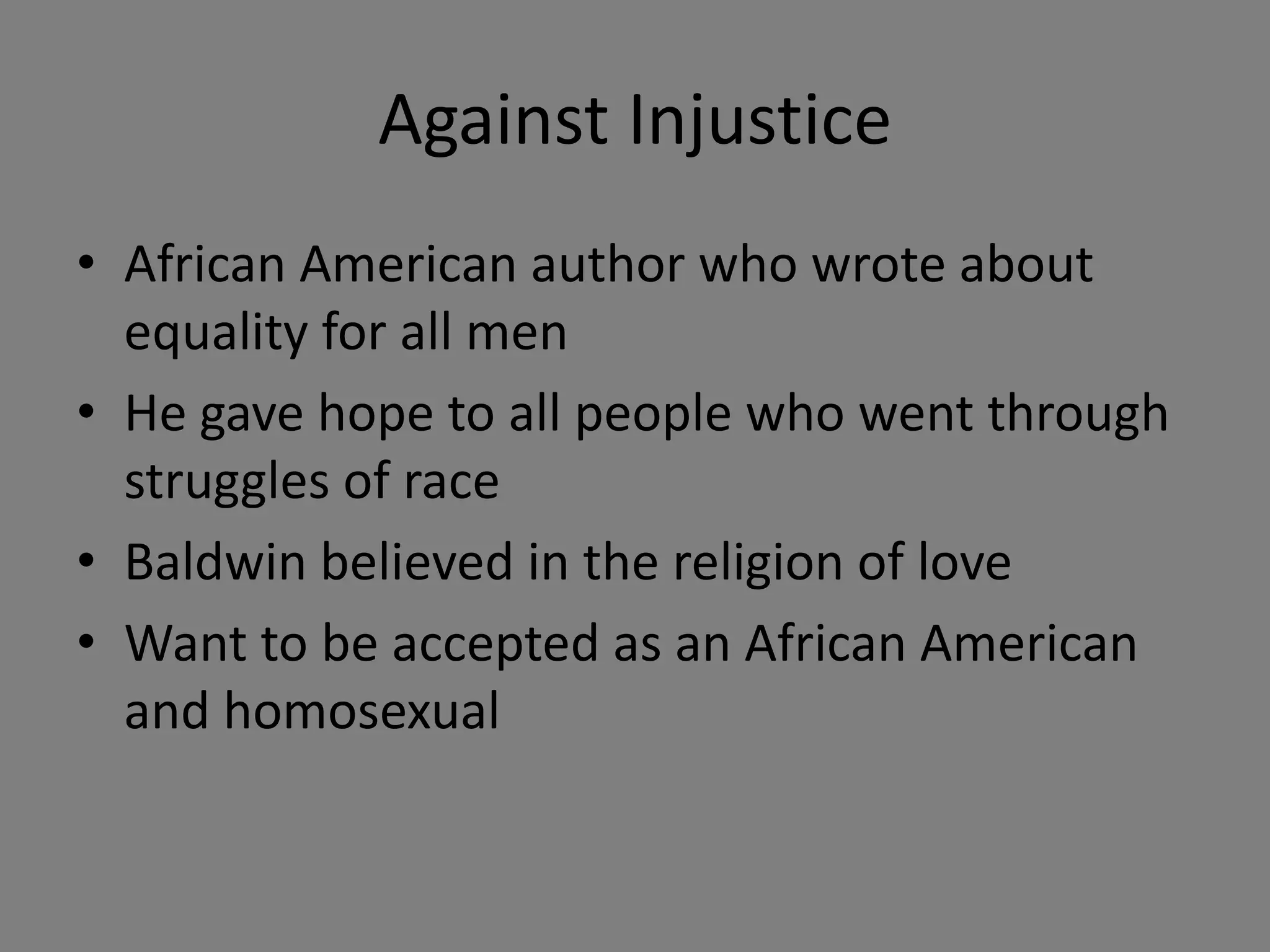 1) James Baldwin was an African American author who wrote about equality for all people and struggled with his identities as an African American and homosexual.