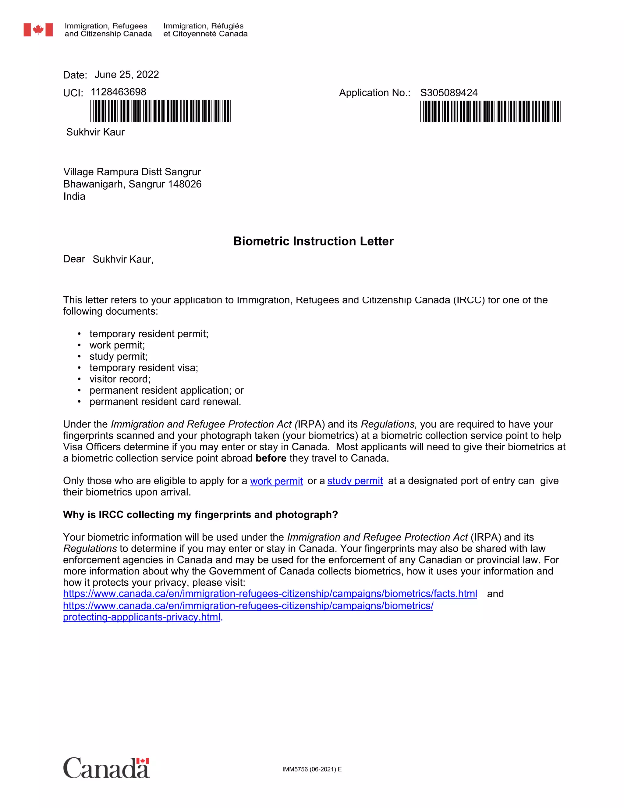 This document is a letter informing Sukhvir Kaur that she must provide her biometrics (fingerprints and photograph) to Immigration, Refugees and Citizenship Canada (IRCC) as part of her application for a study or work permit. It explains that her biometrics will be used to determine her eligibility to enter or remain in Canada and may be shared with law enforcement. The letter provides details on where and how to submit her biometrics, noting she must do so by July 26th, 2022 or her application may be refused. It also gives instructions on what to bring and exemptions for medical conditions.