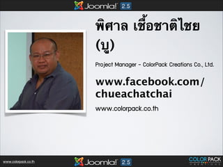 Slide อบรม Joomla! 2.5 จัดทำขึ้นเพื่อใช้ ประกอบการ อบรม Joomla! 2.5 โดยคุณ พิศาล เชื้อชาติไชย บริษัท ColorPack Creations Co., Ltd. สามารถนำไปเผยแพร่ แจกจ่าย ได้โดยไม่มีค่าใช้จ่าย แต่ขอความกรุณา อย่าลบ เครดิตของบริษัท ที่อยู่ใน Slide นี้