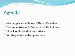 The document discusses common web application security threats like cross-site request forgery (CSRF), cross-site scripting (XSS), and SQL injections. It provides examples of each threat and explains how Joomla handles them, such as by adding tokens for CSRF protection and escaping user input. The document also covers other attacks like direct code access, register globals being on, and outlines best practices for secure web development like input sanitization and validation.