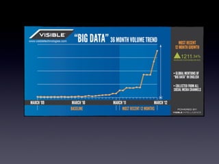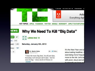 Big data refers to the massive amounts of data being created from various sources such as social media posts, website transactions, and sensor readings. It is characterized by its volume, velocity, and variety. New technologies and the digitization of information have led to an explosion in big data. Tools like Hadoop, R, and Hive help analyze big data across distributed systems. Analyzing big data can reveal patterns and make predictions to help organizations make better decisions. Open data and APIs also make some big data publicly available for analysis.