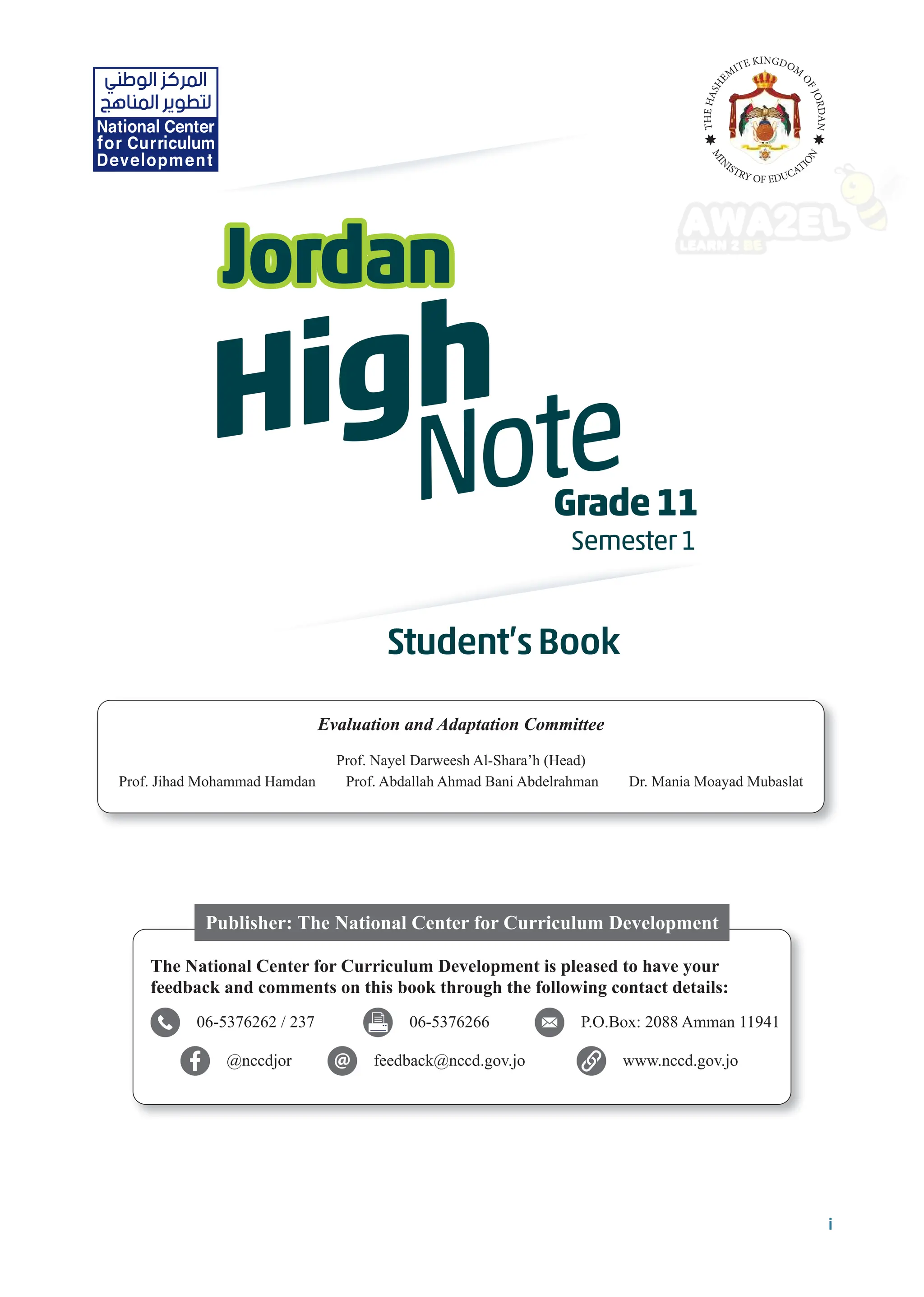 The document is the Grade 11 Semester 1 Student's Book from the National Center for Curriculum Development of Jordan, which has been officially adopted by the Ministry of Education for the academic year 2024/2025. It outlines various educational units covering grammar, vocabulary, reading, and writing skills. The book aims to provide a comprehensive framework for English language learning, supported by academic contributions and evaluation by a committee of education professionals.