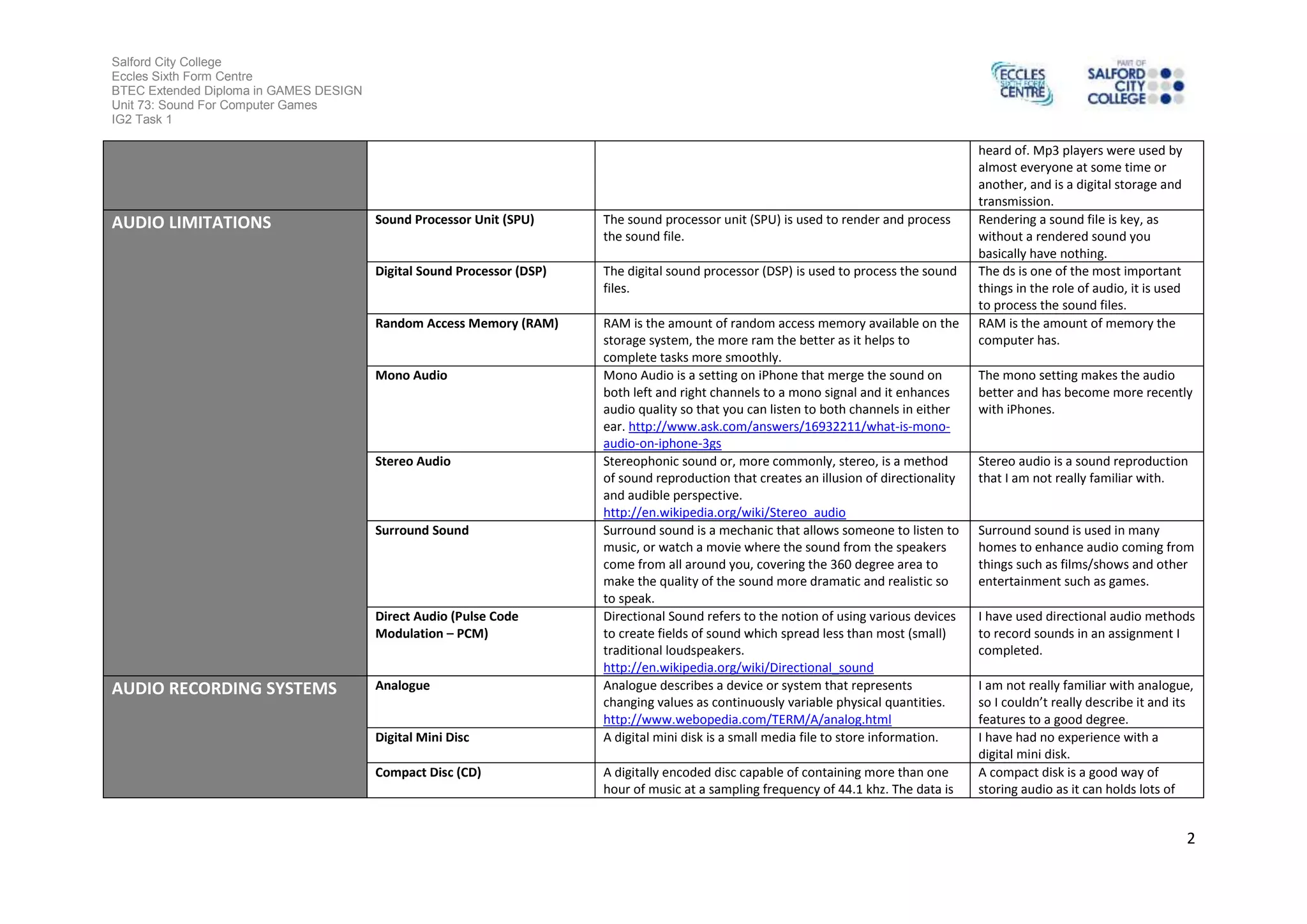 The document is a glossary of terms related to sound design and production created by a student named Jordan Smith. It contains definitions for over 20 terms gathered from online research and describes how some of the terms relate to Jordan's own production practice. The glossary covers areas such as foley artistry, sound file formats, audio limitations, audio recording systems, audio sampling, and more. For each term, Jordan provides a short definition from an online source as well as occasional comments on their relevance to or experience with the term.