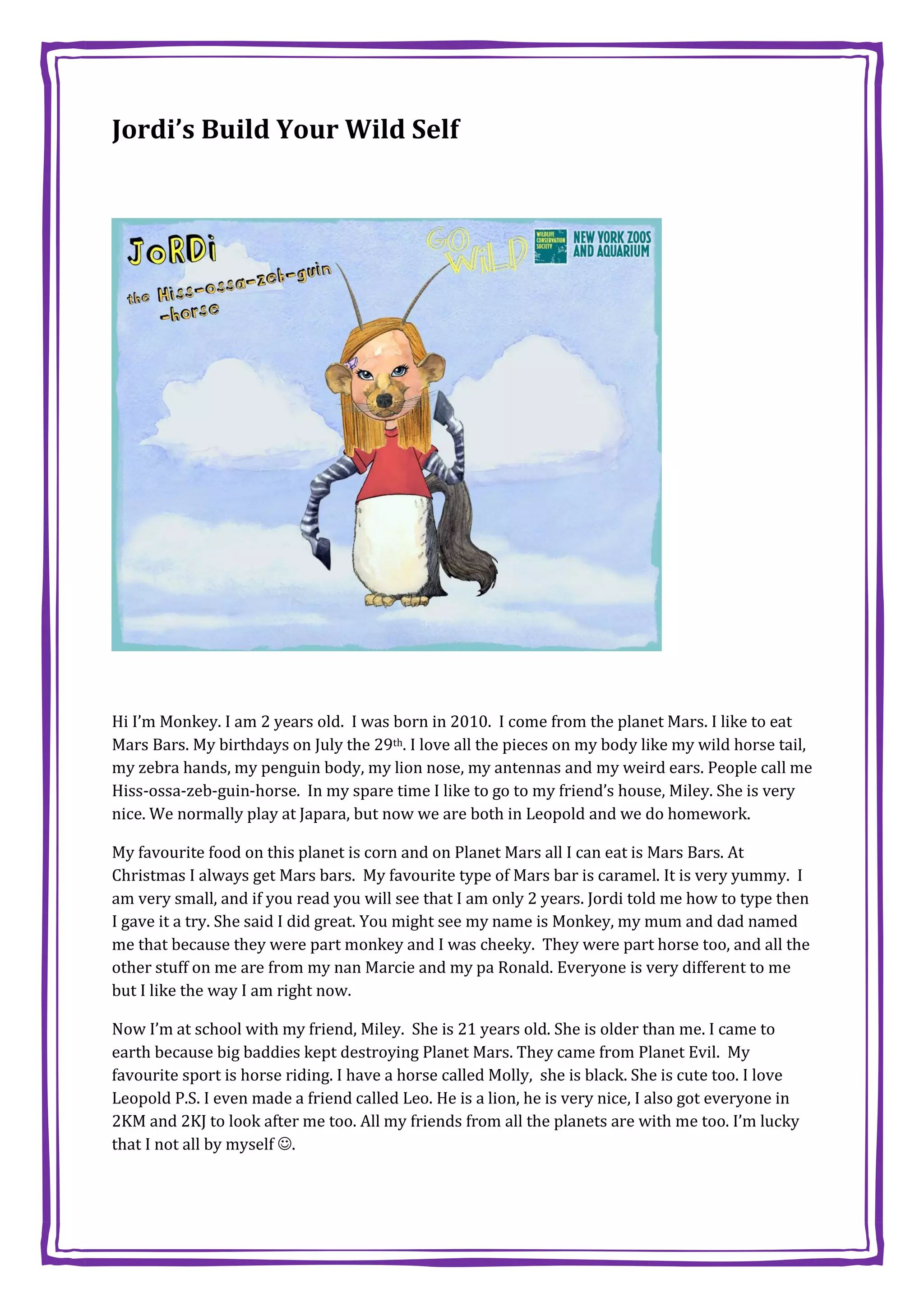 Monkey is a 2-year-old who was born on Mars in 2010. He has the body of a penguin, a lion nose, horse tail, zebra hands, and antennas. Monkey likes to eat Mars Bars and corn. He is friends with Miley, a 21-year-old girl, and they do homework together at Leopold Primary School. Monkey had to leave Mars because it was being destroyed by invaders from Planet Evil.