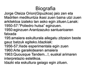 Biografia Jorge OteizaOrion(Gipuzkoa) jaio zen eta Madrilen medikuntza ikasi zuen baina utzi zuen arkitektoa izateko lan asko egin zituen.Lanak: 1950-57:”Poliedro hutsa” eginzuen. 1950:eginzuen Arantzazuko santuarioaren fatxada 195:amaiera eskulturala ailegatu zitzaion beste gauz batzuk egiteko.Idazkiak: 1956-57:Xede esperimentala egin zuen 1960:Arte garaikidearen amaiera 1963:Quousque Tandem...!, euskal arimaren interpretazio estetikoa. Idazki eta eskultura geiago egin zituen.