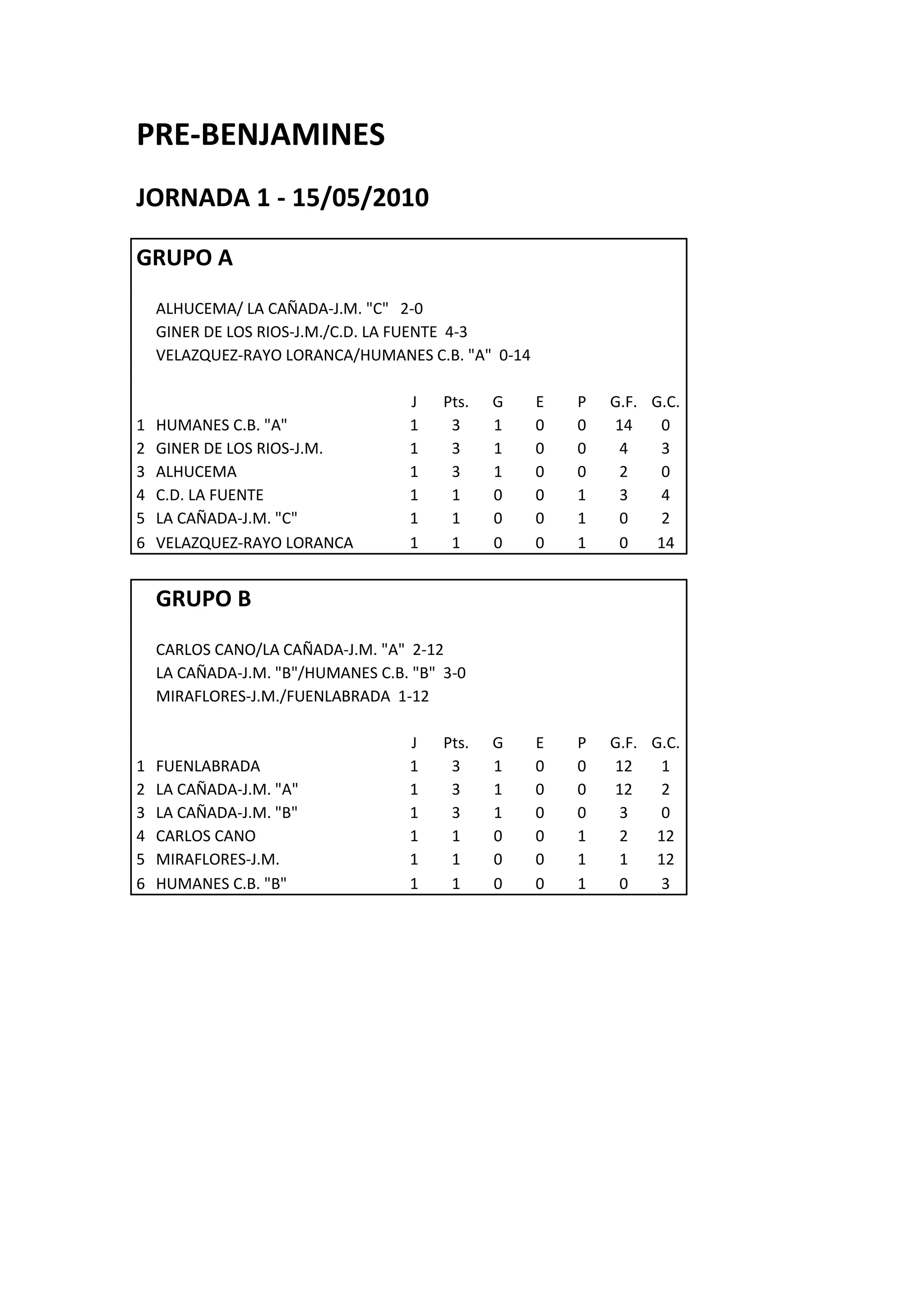 This document appears to contain results from two groups (A and B) in a pre-Benjamines Jornada 1 competition played on 15/05/2010. In Group A, Humanes C.B. "A" defeated VELAZQUEZ-RAYO LORANCA 14-0 and finished first. In Group B, Fuenlabrada finished first with a 1-12 victory over MIRAFLORES-J.M.