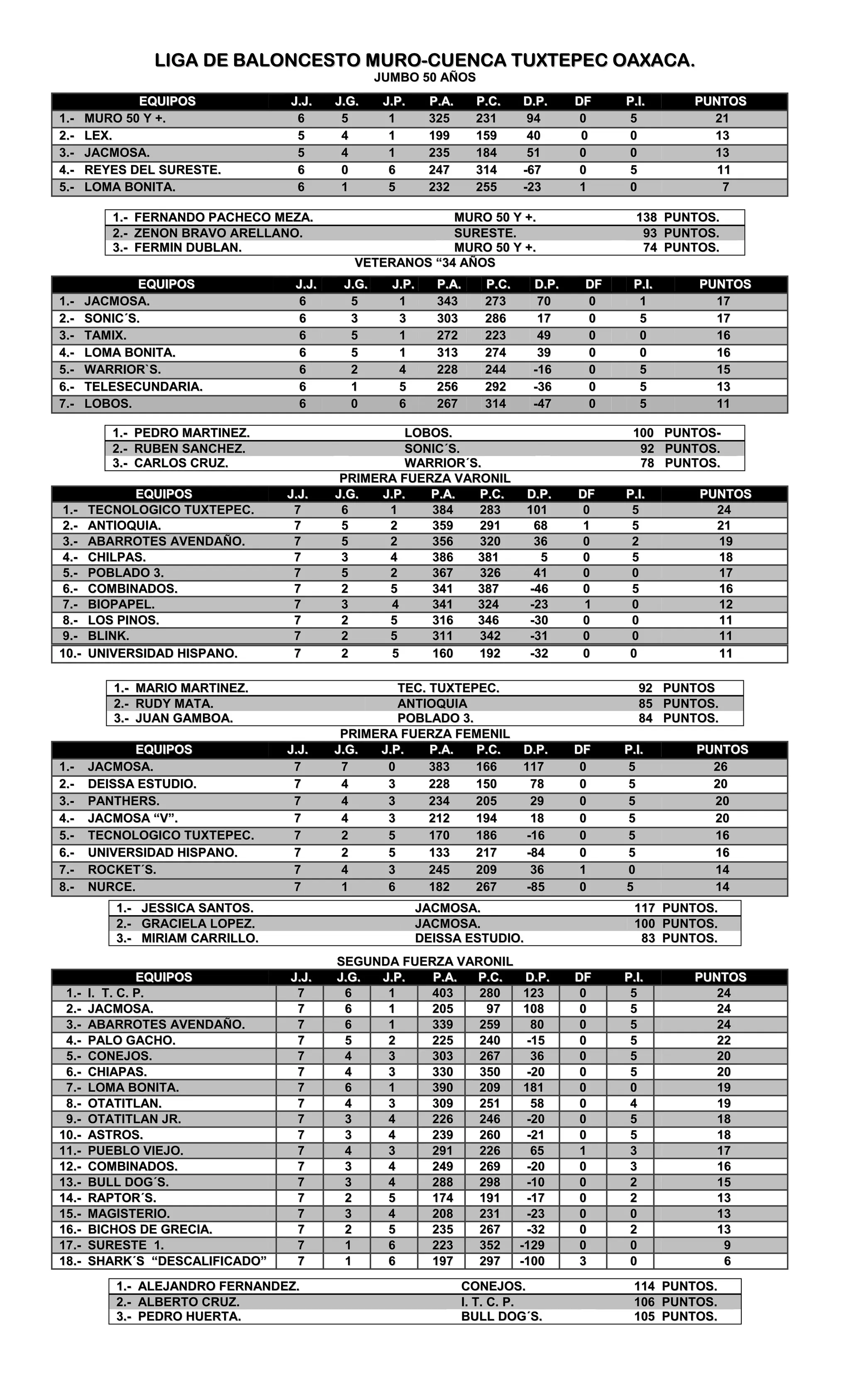 MMUURROO--CCUUEENNCCAA TTUUXXTTEEPPEECC OOAAXXAACCAA.. JJUUMMBBOO 5500 AAÑÑOOSS VVEETTEERRAANNOOSS ““3344 AAÑÑOOSS EEQQUUIIPPOOSS JJ..JJ.. JJ..GG.. JJ..PP.. PP..AA.. PP..CC.. DD..PP.. DDFF PP..II.. PPUUNNTTOOSS 11..-- JJAACCMMOOSSAA.. 66 55 11 334433 227733 7700 00 11 1177 22..-- SSOONNIICC´´SS.. 66 33 33 330033 228866 1177 00 55 1177 33..-- TTAAMMIIXX.. 66 55 11 227722 222233 4499 00 00 1166 44..-- LLOOMMAA BBOONNIITTAA.. 66 55 11 331133 227744 3399 00 00 1166 55..-- WWAARRRRIIOORR``SS.. 66 22 44 222288 224444 --1166 00 55 1155 66..-- TTEELLEESSEECCUUNNDDAARRIIAA.. 66 11 55 225566 229922 --3366 00 55 1133 77..-- LLOOBBOOSS.. 66 00 66 226677 331144 --4477 00 55 1111 PPRRIIMMEERRAA FFUUEERRZZAA VVAARROONNIILL EEQQUUIIPPOOSS JJ..JJ.. JJ..GG.. JJ..PP.. PP..AA.. PP..CC.. DD..PP.. DDFF PP..II.. PPUUNNTTOOSS 11..-- TTEECCNNOOLLOOGGIICCOO TTUUXXTTEEPPEECC.. 77 66 11 338844 228833 110011 00 55 2244 22..-- AANNTTIIOOQQUUIIAA.. 77 55 22 335599 229911 6688 11 55 2211 33..-- AABBAARRRROOTTEESS AAVVEENNDDAAÑÑOO.. 77 55 22 335566 332200 3366 00 22 1199 44..-- CCHHIILLPPAASS.. 77 33 44 338866 338811 55 00 55 1188 55..-- PPOOBBLLAADDOO 33.. 77 55 22 336677 332266 4411 00 00 1177 66..-- CCOOMMBBIINNAADDOOSS.. 77 22 55 334411 338877 --4466 00 55 1166 77..-- BBIIOOPPAAPPEELL.. 77 33 44 334411 332244 --2233 11 00 1122 88..-- LLOOSS PPIINNOOSS.. 77 22 55 331166 334466 --3300 00 00 1111 99..-- BBLLIINNKK.. 77 22 55 331111 334422 --3311 00 00 1111 PPRRIIMMEERRAA FFUUEERRZZAA FFEEMMEENNIILL EEQQUUIIPPOOSS JJ..JJ.. JJ..GG.. JJ..PP.. PP..AA.. PP..CC.. DD..PP.. DDFF PP..II.. PPUUNNTTOOSS 11..-- JJAACCMMOOSSAA.. 77 77 00 338833 116666 111177 00 55 2266 22..-- DDEEIISSSSAA EESSTTUUDDIIOO.. 77 44 33 222288 115500 7788 00 55 2200 33..-- PPAANNTTHHEERRSS.. 77 44 33 223344 220055 2299 00 55 2200 44..-- JJAACCMMOOSSAA ““VV””.. 77 44 33 221122 119944 1188 00 55 2200 55..-- TTEECCNNOOLLOOGGIICCOO TTUUXXTTEEPPEECC.. 77 22 55 117700 118866 --1166 00 55 1166 66..-- UUNNIIVVEERRSSIIDDAADD HHIISSPPAANNOO.. 77 22 55 113333 221177 --8844 00 55 1166 77..-- RROOCCKKEETT´´SS.. 77 44 33 224455 220099 3366 11 00 1144 88..-- NNUURRCCEE.. 77 11 66 118822 226677 --8855 00 55 1144 SSEEGGUUNNDDAA FFUUEERRZZAA VVAARROONNIILL EEQQUUIIPPOOSS JJ..JJ.. JJ..GG.. JJ..PP.. PP..AA.. PP..CC.. DD..PP.. DDFF PP..II.. PPUUNNTTOOSS 11..-- II.. TT.. CC.. PP.. 77 66 11 440033 228800 112233 00 55 2244 22..-- JJAACCMMOOSSAA.. 77 66 11 220055 9977 110088 00 55 2244 33..-- AABBAARRRROOTTEESS AAVVEENNDDAAÑÑOO.. 77 66 11 333399 225599 8800 00 55 2244 44..-- PPAALLOO GGAACCHHOO.. 77 55 22 222255 224400 --1155 00 55 2222 55..-- CCOONNEEJJOOSS.. 77 44 33 330033 226677 3366 00 55 2200 66..-- CCHHIIAAPPAASS.. 77 44 33 333300 335500 --2200 00 55 2200 77..-- LLOOMMAA BBOONNIITTAA.. 77 66 11 339900 220099 118811 00 00 1199 88..-- OOTTAATTIITTLLAANN.. 77 44 33 330099 225511 5588 00 44 1199 99..-- OOTTAATTIITTLLAANN JJRR.. 77 33 44 222266 224466 --2200 00 55 1188 1100..-- AASSTTRROOSS.. 77 33 44 223399 226600 --2211 00 55 1188 1111..-- PPUUEEBBLLOO VVIIEEJJOO.. 77 44 33 229911 222266 6655 11 33 1177 1122..-- CCOOMMBBIINNAADDOOSS.. 77 33 44 224499 226699 --2200 00 33 1166 1133..-- BBUULLLL DDOOGG´´SS.. 77 33 44 228888 229988 --1100 00 22 1155 1144..-- RRAAPPTTOORR´´SS.. 77 22 55 117744 119911 --1177 00 22 1133 1155..-- MMAAGGIISSTTEERRIIOO.. 77 33 44 220088 223311 --2233 00 00 1133 1166..-- BBIICCHHOOSS DDEE GGRREECCIIAA.. 77 22 55 223355 226677 --3322 00 22 1133 1177..-- SSUURREESSTTEE 11.. 77 11 66 222233 335522 --112299 00 00 99 1188..-- SSHHAARRKK´´SS ““DDEESSCCAALLIIFFIICCAADDOO”” 77 11 66 119977 229977 --110000 33 00 66 EEQQUUIIPPOOSS JJ..JJ.. JJ..GG.. JJ..PP.. PP..AA.. PP..CC.. DD..PP.. DDFF PP..II.. PPUUNNTTOOSS 11..-- MMUURROO 5500 YY ++.. 66 55 11 332255 223311 9944 00 55 2211 22..-- LLEEXX.. 55 44 11 119999 115599 4400 00 00 1133 33..-- JJAACCMMOOSSAA.. 55 44 11 223355 118844 5511 00 00 1133 44..-- RREEYYEESS DDEELL SSUURREESSTTEE.. 66 00 66 224477 331144 --6677 00 55 1111 55..-- LLOOMMAA BBOONNIITTAA.. 66 11 55 223322 225555 --2233 11 00 77 11..-- FFEERRNNAANNDDOO PPAACCHHEECCOO MMEEZZAA.. MMUURROO 5500 YY ++.. 113388 PPUUNNTTOOSS.. 22..-- ZZEENNOONN BBRRAAVVOO AARREELLLLAANNOO.. SSUURREESSTTEE.. 9933 PPUUNNTTOOSS.. 33..-- FFEERRMMIINN DDUUBBLLAANN.. MMUURROO 5500 YY ++.. 7744 PPUUNNTTOOSS.. 11..-- PPEEDDRROO MMAARRTTIINNEEZZ.. LLOOBBOOSS.. 110000 PPUUNNTTOOSS-- 22..-- RRUUBBEENN SSAANNCCHHEEZZ.. SSOONNIICC´´SS.. 9922 PPUUNNTTOOSS.. 33..-- CCAARRLLOOSS CCRRUUZZ.. WWAARRRRIIOORR´´SS.. 7788 PPUUNNTTOOSS.. 1100..-- UUNNIIVVEERRSSIIDDAADD HHIISSPPAANNOO.. 77 22 55 116600 119922 --3322 00 00 1111 11..-- MMAARRIIOO MMAARRTTIINNEEZZ.. TTEECC.. TTUUXXTTEEPPEECC.. 9922 PPUUNNTTOOSS 22..-- RRUUDDYY MMAATTAA.. AANNTTIIOOQQUUIIAA 8855 PPUUNNTTOOSS.. 33..-- JJUUAANN GGAAMMBBOOAA.. PPOOBBLLAADDOO 33.. 8844 PPUUNNTTOOSS.. 11..-- JJEESSSSIICCAA SSAANNTTOOSS.. JJAACCMMOOSSAA.. 111177 PPUUNNTTOOSS.. 22..-- GGRRAACCIIEELLAA LLOOPPEEZZ.. JJAACCMMOOSSAA.. 110000 PPUUNNTTOOSS.. 33..-- MMIIRRIIAAMM CCAARRRRIILLLLOO.. DDEEIISSSSAA EESSTTUUDDIIOO.. 8833 PPUUNNTTOOSS.. 11..-- AALLEEJJAANNDDRROO FFEERRNNAANNDDEEZZ.. CCOONNEEJJOOSS.. 111144 PPUUNNTTOOSS.. 22..-- AALLBBEERRTTOO CCRRUUZZ.. II.. TT.. CC.. PP.. 110066 PPUUNNTTOOSS.. 33..-- PPEEDDRROO HHUUEERRTTAA.. BBUULLLL DDOOGG´´SS.. 110055 PPUUNNTTOOSS..