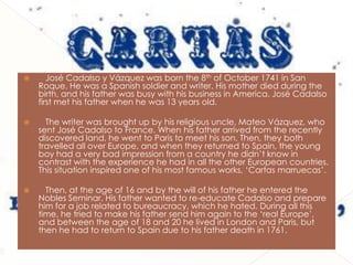 José Cadalso y Vázquez was a Spanish soldier and writer born in 1741. He was raised by his uncle after his mother died in childbirth and his father was away in America. Cadalso travelled extensively through Europe in his youth but disliked Spain upon returning. He wrote one of his most famous works, 'Cartas marruecas', based on this experience. Cadalso later joined the army against his wishes but found success as a writer in Madrid until criticism of civilians led to his temporary exile, where he wrote more poems. He is best remembered for his poem 'Noches lúgubres' written after the death of his love. Cadalso died during the siege of Gibraltar in